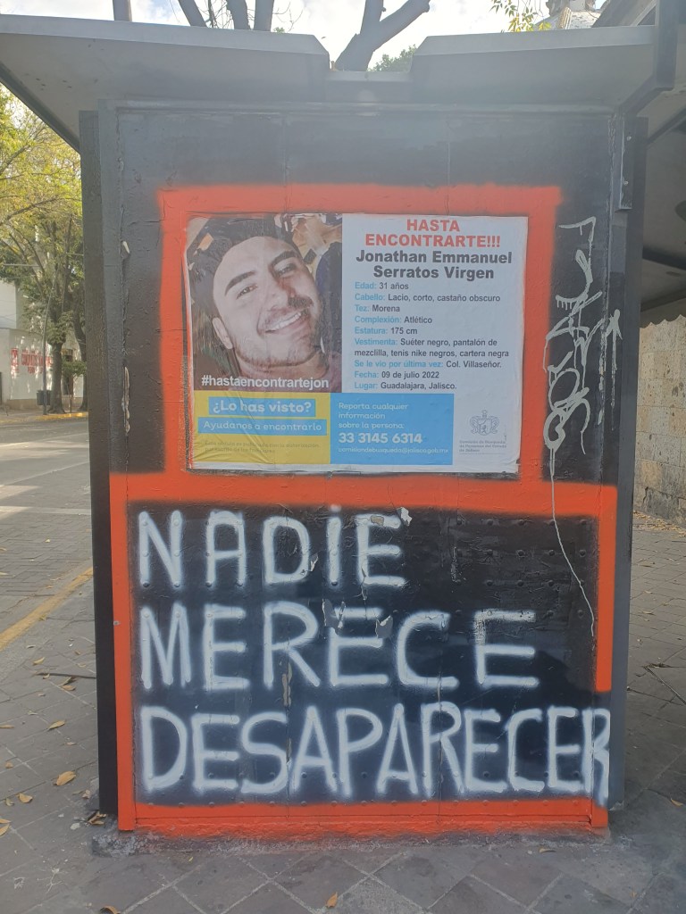 Mtenaespinoza, CC BY-SA 4.0 https://creativecommons.org/licenses/by-sa/4.0, via Wikimedia Commons. The spray paint says “No one deserves to disappear,” and the heading in red before his name and other information says “Until we find you!!!”