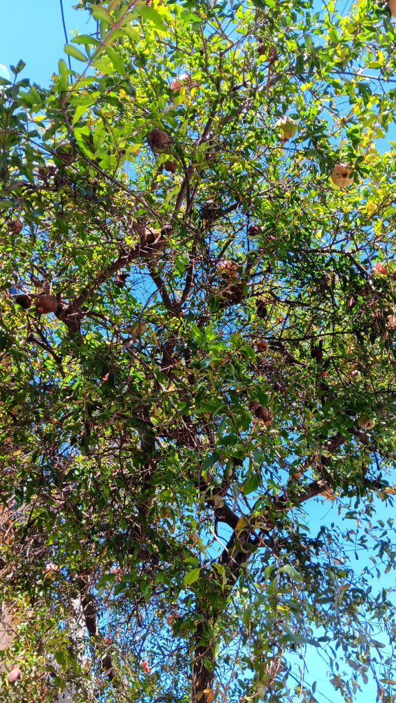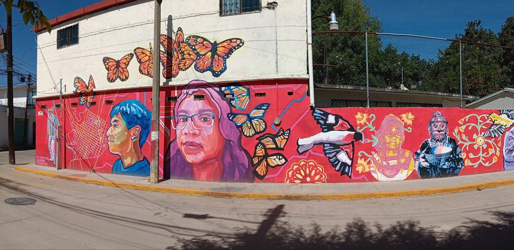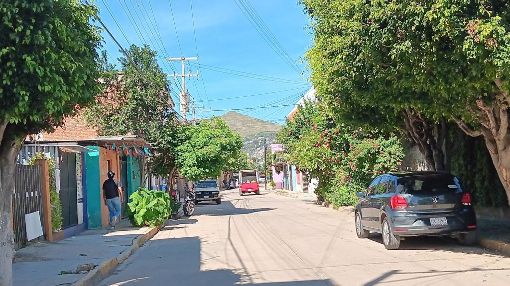 The street just outside the place we’re stayingI don’t want to eat gelatina for breakfast (or ever), but I feel a pleasant nostalgia seeing it set out at tiny little home-based establishments.Pomegranate tree“Movimiento,” a beautiful mural a few blocks away. Oaxaca’s indigenous people show up here and so many places.Is this what happens if you let an impatiens grow into a tree? It might be. Día de los Muertos is coming soon and already celebrated, with cempazuchiles (marigolds) everywhere.This made me laugh. The sign asks drivers please not to park in the pedestrian crosswalk, marked by steel bumps and orange paint. It’s having no effect.