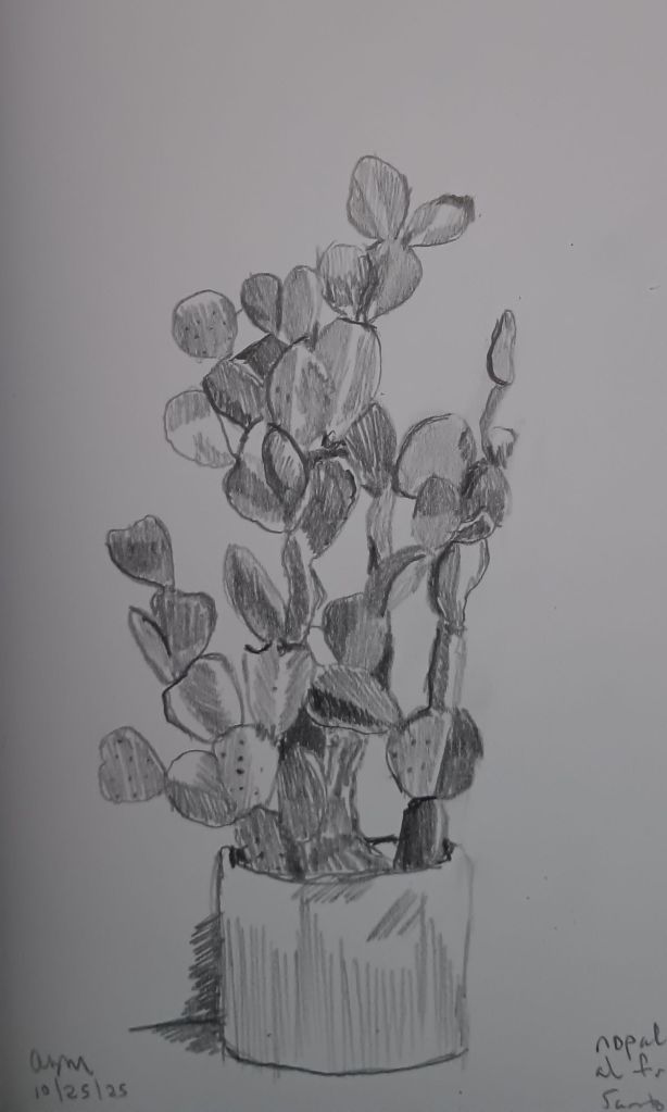Why I carry my sketchbook and notebook with me. When our feet get tired and it’s time to sit and rest, I can write or draw, which makes the extra several ounces in my backpack very worthwhile. Yesterday, when the heat and elevation forced a rest, this nopal cactus across the street from the Santo Domingo church caught my eye.