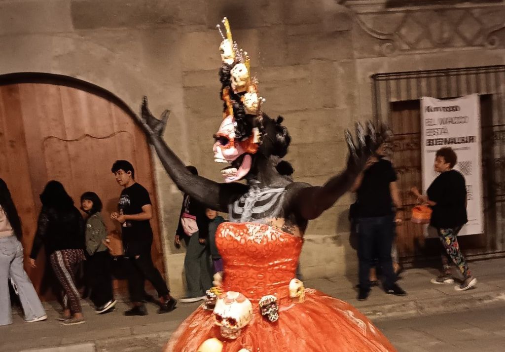 A lot of the decorations around doorways and such use fake cempazuchiles, but the real ones are also brought in by the truckload. The corners of the Zócalo, the main square, have these entrances set up.On the Alcalá, the pedestrian street running south to the Zócalo, there have been lots of dances, songs, theater performances, and parades–more than usual, or I guess all I can be sure of is more than six years ago. I think the intensity has increased because of the fiesta. I hope the person who did this performer’s makeup knew a lot of the applause was for them. Just gorgeous.