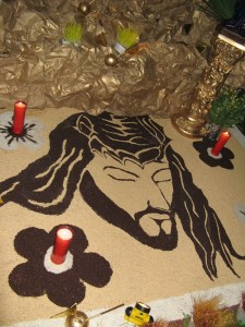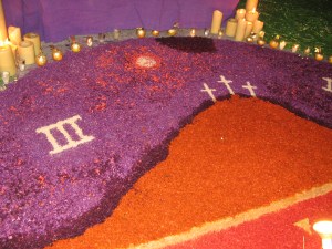The next celebration after El Señor de la Columna was on the following Friday–two days before Palm Sunday–which is Viernes de Dolores, Friday of the Sorrows. It isn´t celebrated in most of the country, but it is spectacular here in San Miguel. People create altars in their homes and shops and invite everyone in. The focal point of most is a figure or painting of Mary. (The munchkin got into the swing of things and started judging whether each Mary looked sad or not after I told her that the holiday was about Mary being sad and was called “the day of being sad.” Joy translated it more literally, if less reverently, as “Pain Friday.”) Jesus also figures prominently, of course. I loved the one made of different-colored seeds: