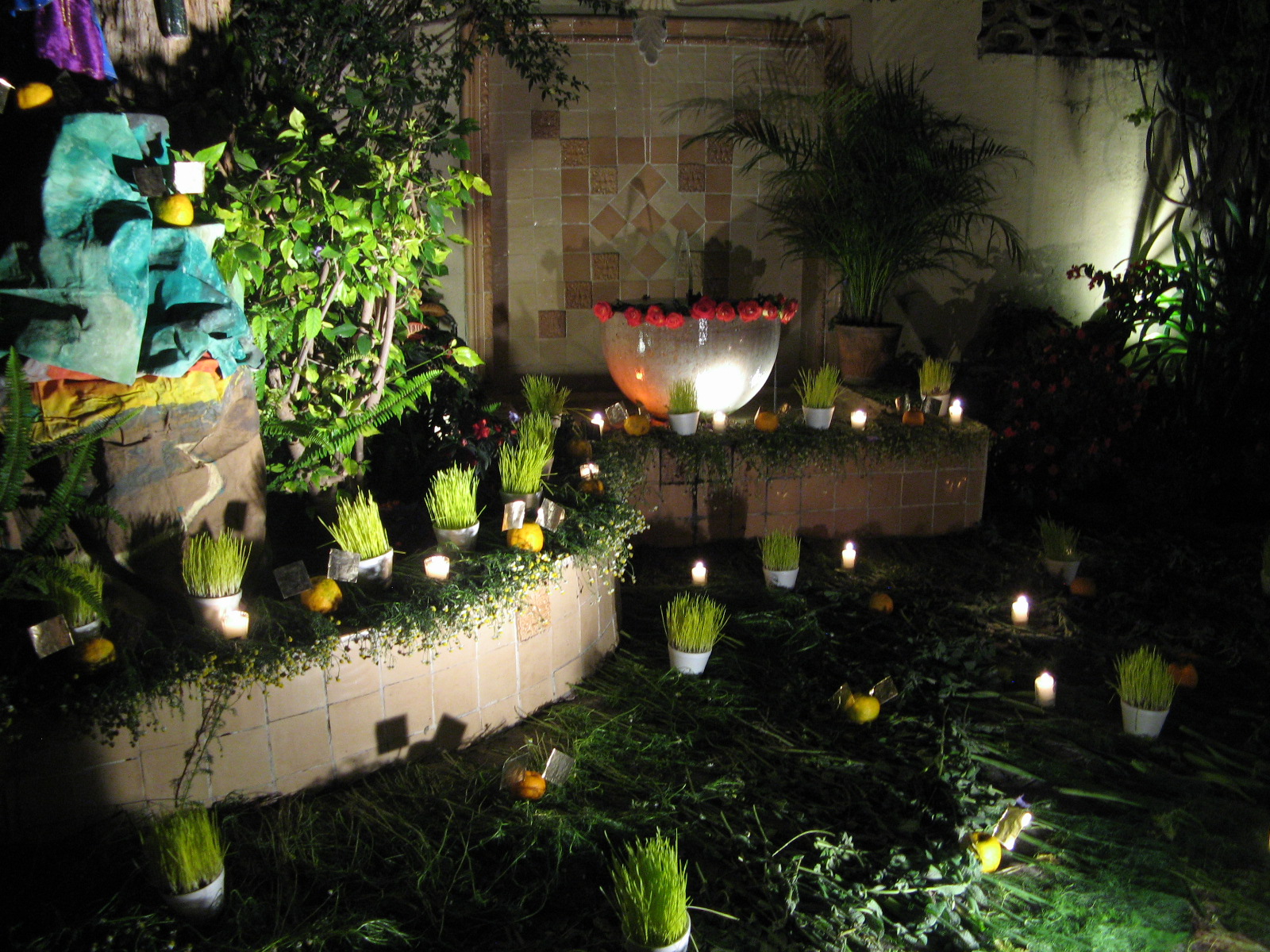 Almost all of the altars had candles, wheat grass (symbolizing our daily bread, if I understood the explanation correctly—it was in Spanish), sour—not sweet—oranges, silver or foil, papel picado (cut paper), the colors purple and white, and so much chamomile and other herbs that the air around each altar was fragrant.