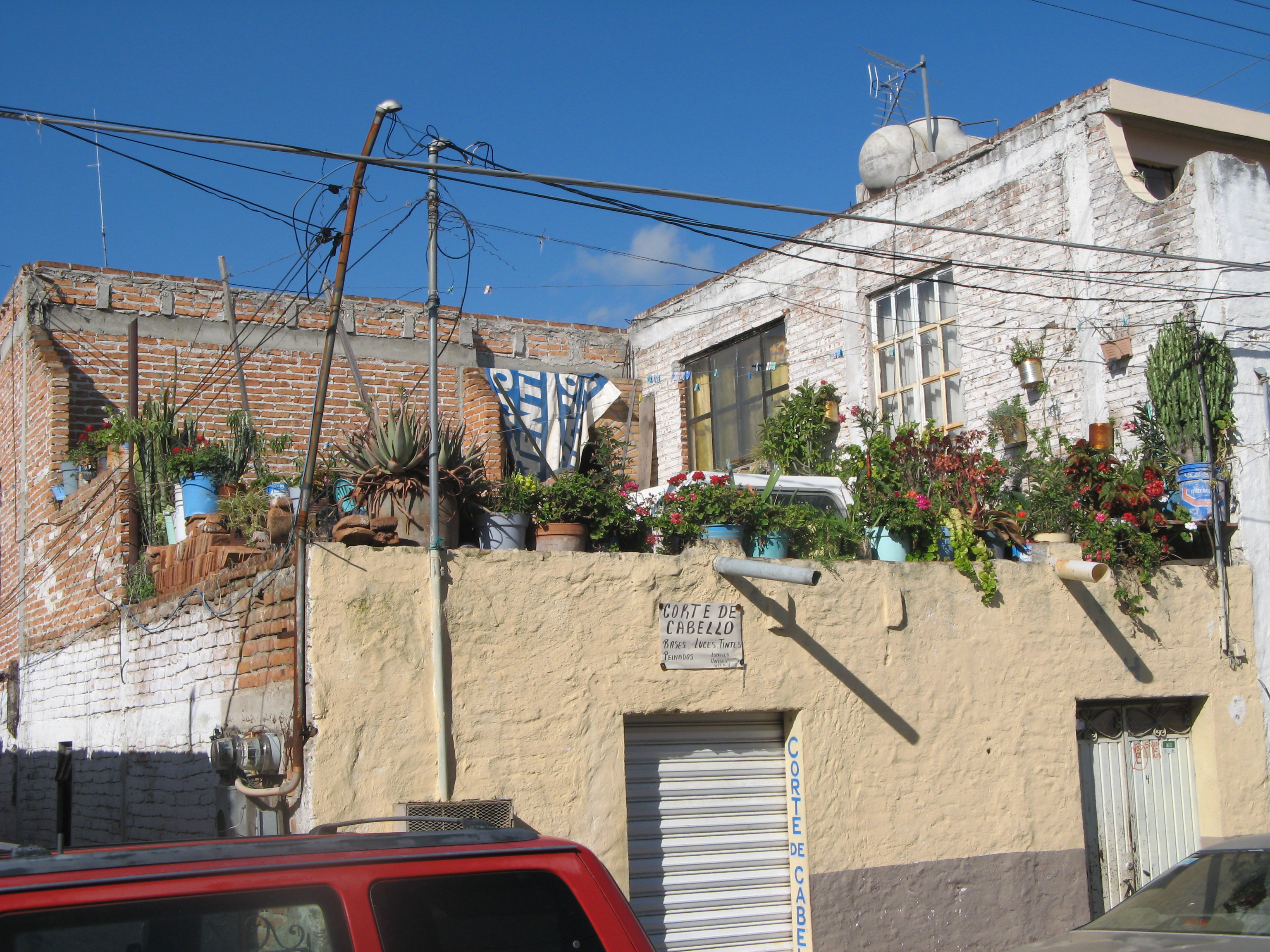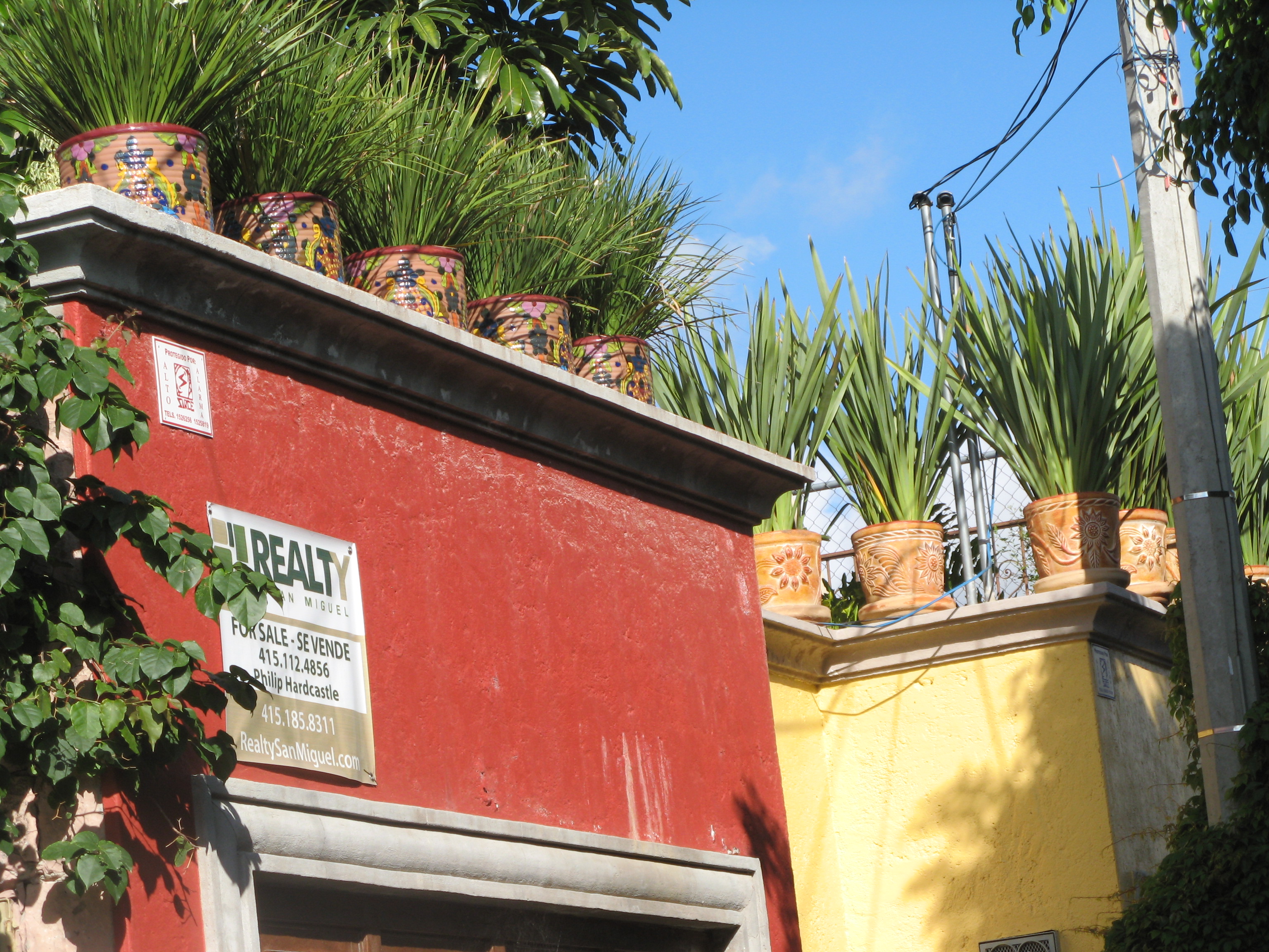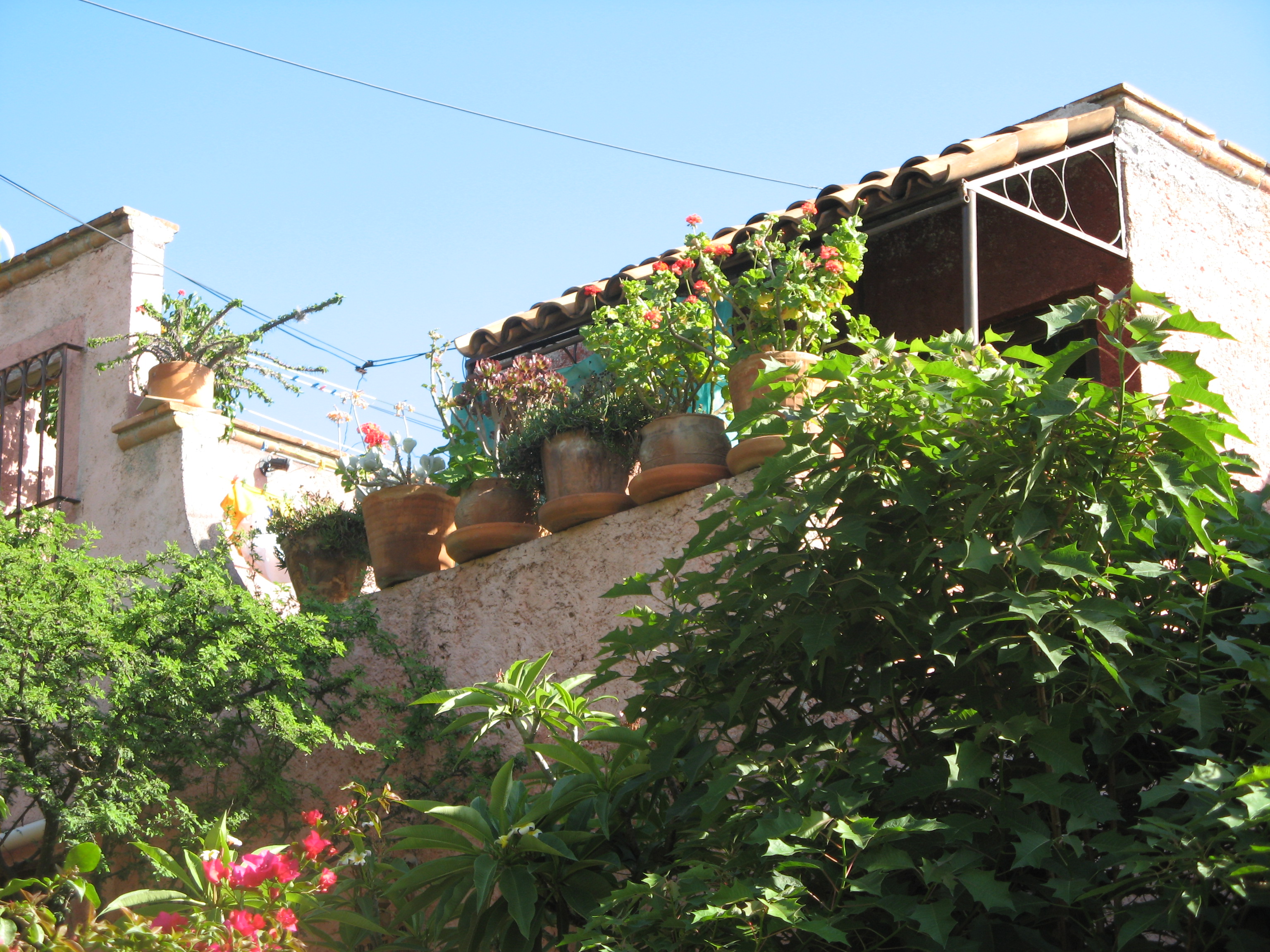 One of my favorites is this cram-something-into-every-can, let-it-all-hang-out demonstration of abundance right across the street from our house. The shop downstairs is where Munchkin gets her hair cut, and is owned by the same people who live here–actually, they don´t just live above but more or less in the shop, since whenever we go there the kids are hanging out watching movies in the same room where their mom cuts hair. She needs another trimming of the bangs; when we go, I’ll have to summon up my Spanish and ask about the garden: