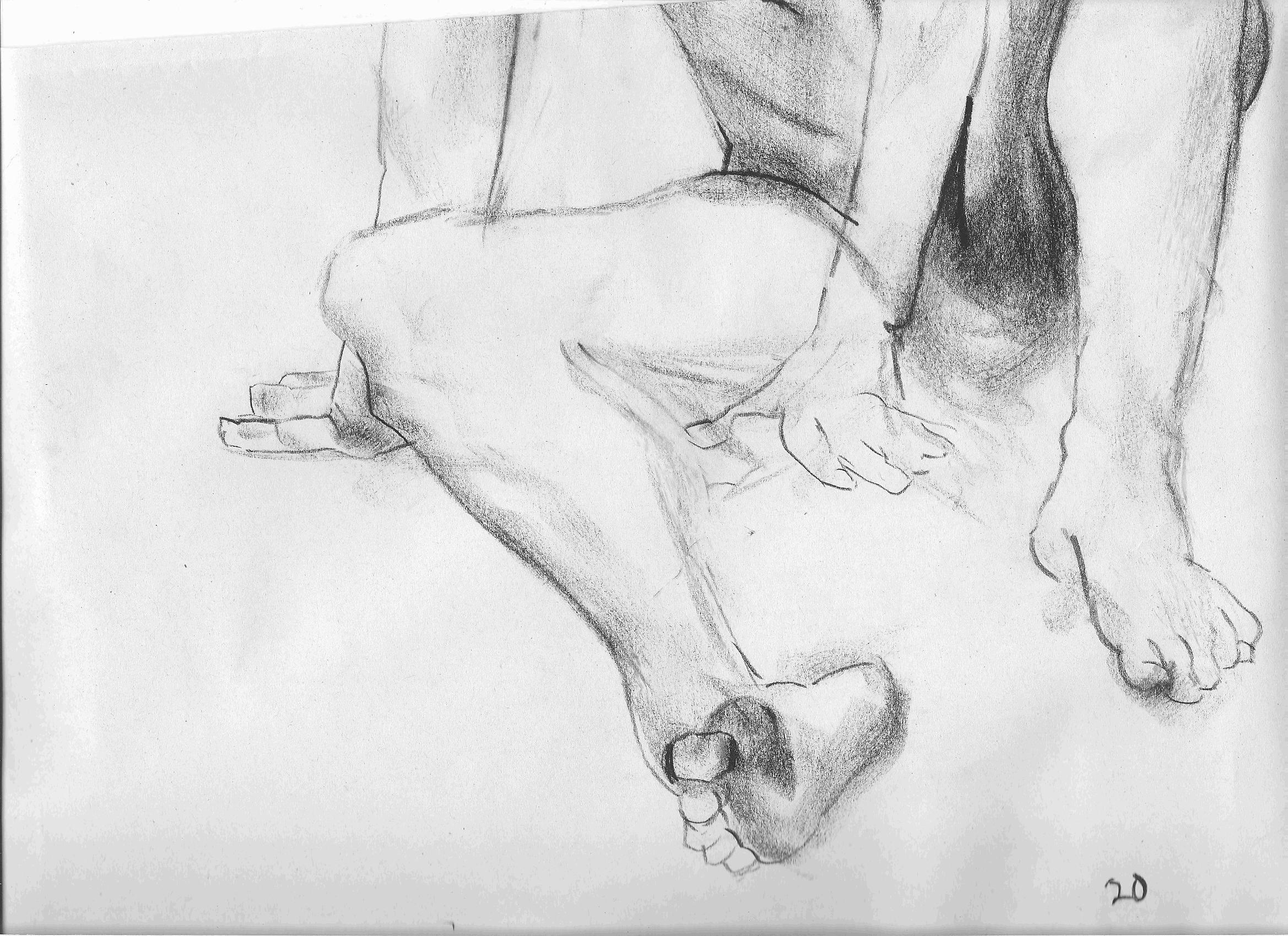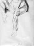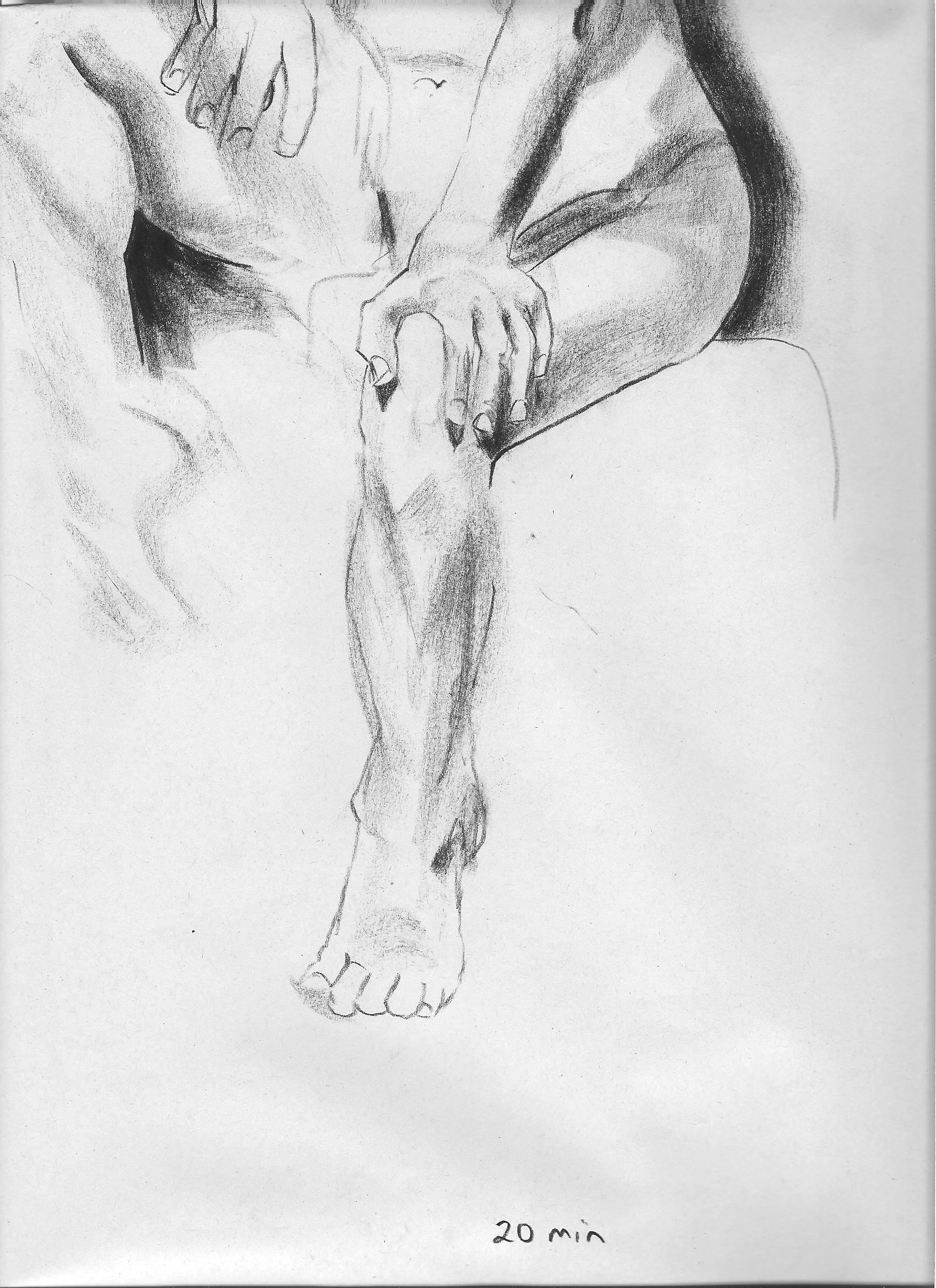 Some days, you’re in the drawing zone, and other days . . . not. Today I just could not make anything I was really happy with. On a couple of drawings, I thought the hands and feet were the best part (hence the detail shots that follow). Maybe that was my problem–too much time spent on the hands and feet, not enough on the rest? Whatever. It’s all learning.