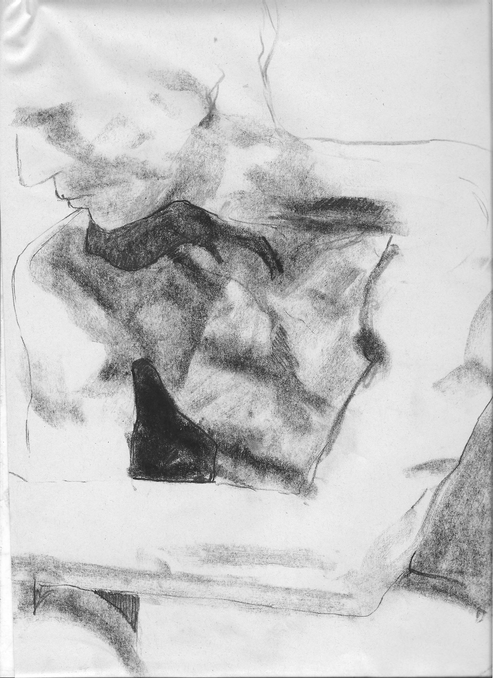 I notice how many different kinds of marks I’m trying here. Lots of experimenting–not wildly, but definitely trying angular marks with the long edge of the charcoal, smudgy ones with small pieces of charcoal, lines with pencil. My favorite thing in all four drawings is the hand on the first one.