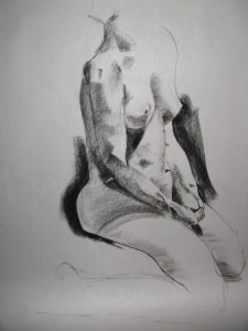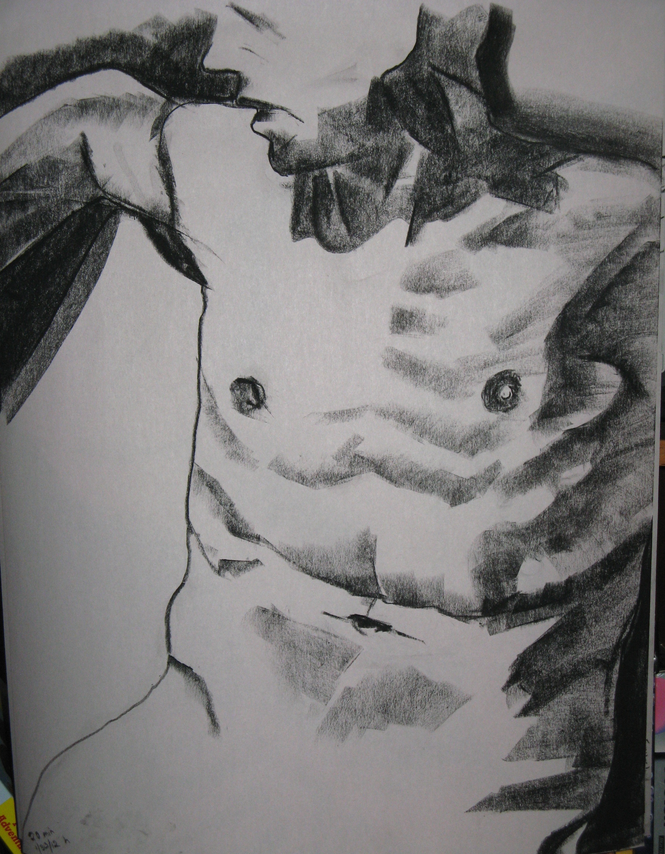 She wanted to know why I draw all in black, white, and gray, instead of in color the way she does. I told her the truth, which is that it’s hard enough for me to manage black and white and I’m not up for the challenge of color right now. She also asked why I draw people naked instead of in their clothes. I said because that way I can see a lot of the beautiful parts that clothes cover up. She looked unconvinced. I think for her, clothes are more interesting and probably more beautiful.