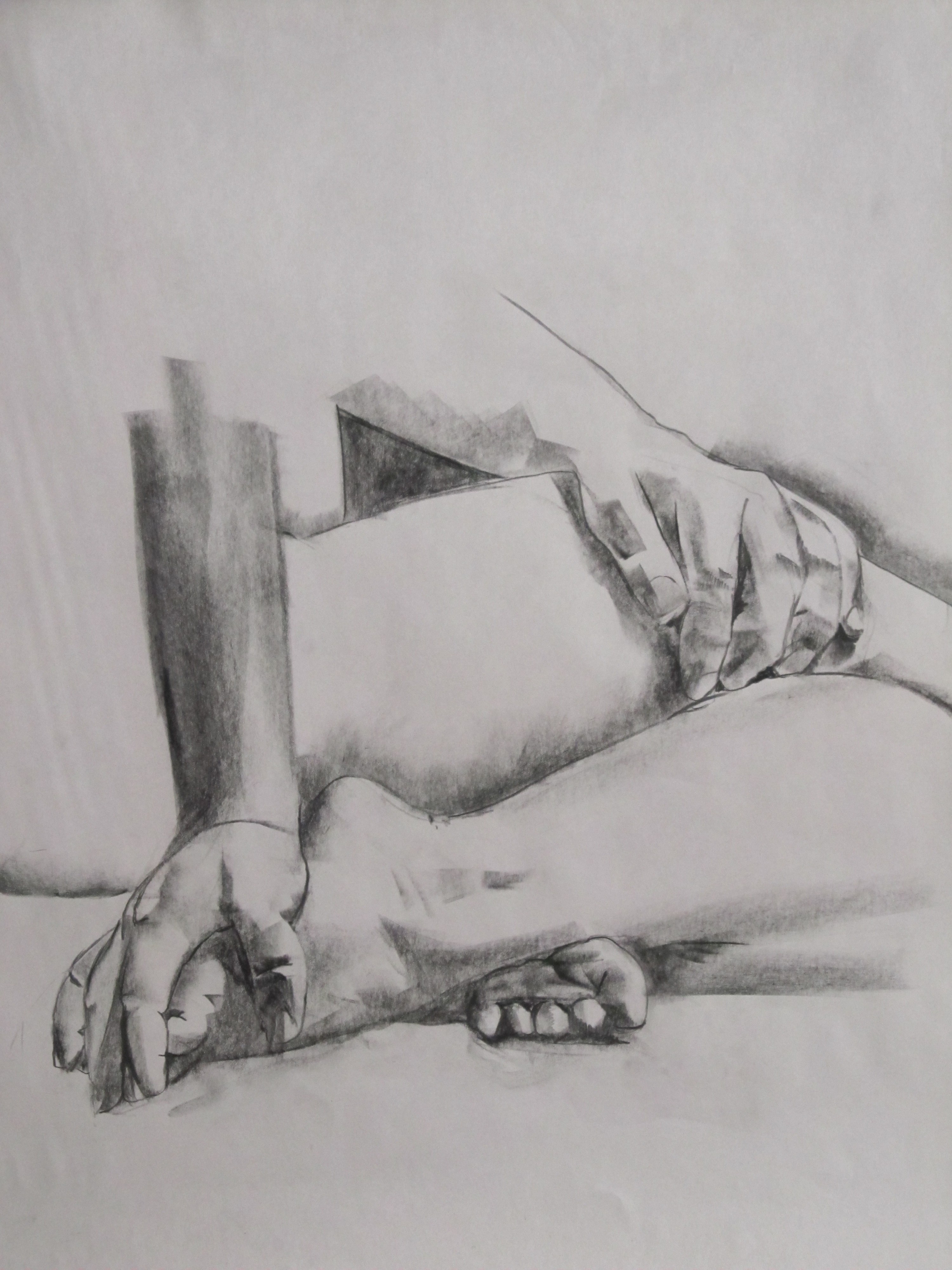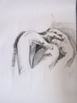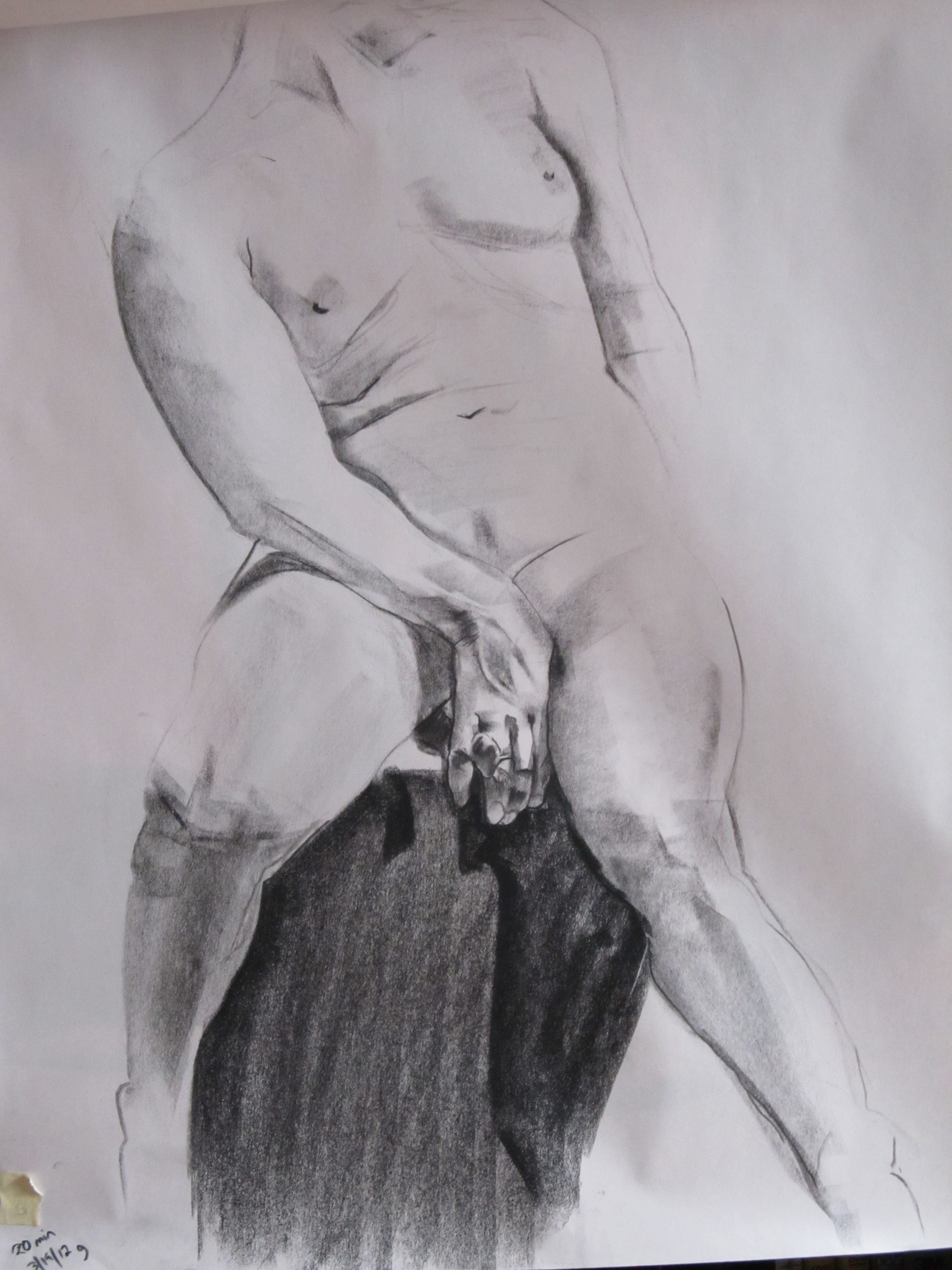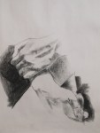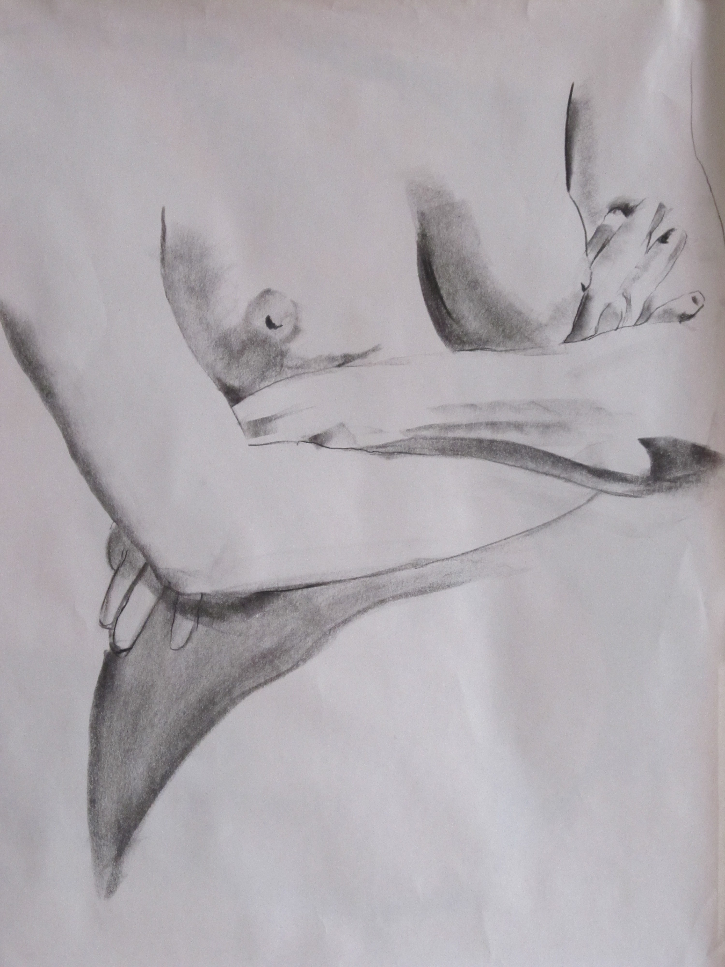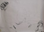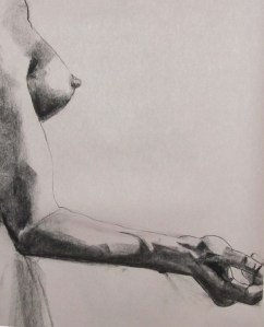 My aim in this one was to include both hands. The left one got short shrift and so came out flat. The right one, though, is a lesson to me in how few marks are needed to make the full shapes emerge. It’s quite minimal and yet it works, unlike the more elaborate shading on the forearm.