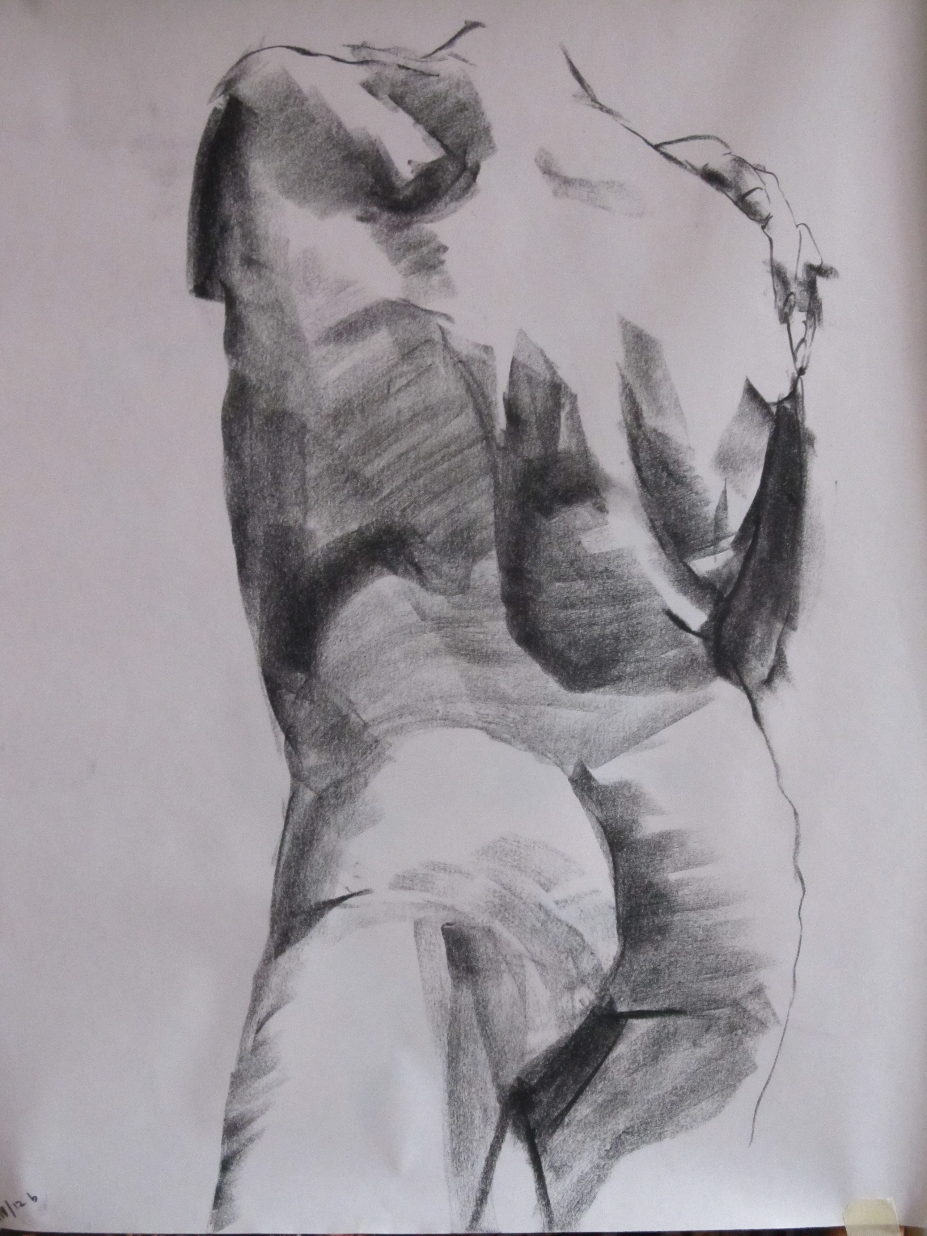 On this one I made myself work fast. It was only a seven-minute pose but I really wanted her whole torso and that nice twist of her neck, so fast was the only option. I tend to fuss too much over details, so speed is a good antidote.