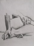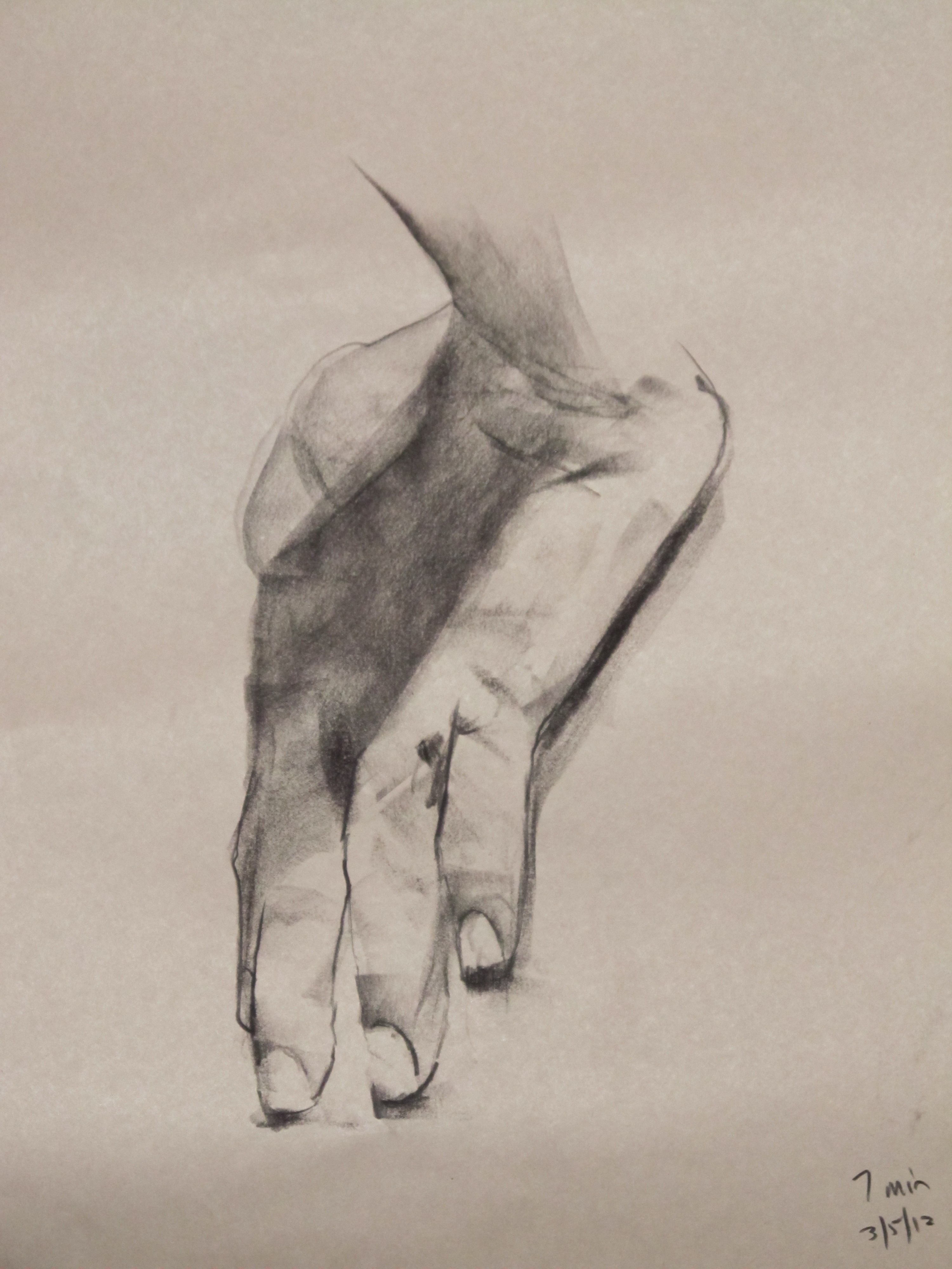 I loved working on this hand, with its big ring and relaxed position. The finger the ring is on didn’t work right. The two on either side bend but it just looks, I don’t know, mangled. Fingers are almost like eyes: a few lines and shadows are enough to show their true shape; get one wrong by a little bit, and suddenly they are barely recognizable. And hands are almost as expressive as faces. I’ve been trying to sit up close so that even my increasingly myopic eyes can focus on the model’s hands without squinting, because they are still mostly what I want to draw. Although this one, Woman with Mangled Middle Finger, captures the overall expression of the pose too: