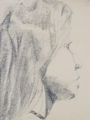 I generally leave off faces because drawing the face will probably require as much time as the rest put together, and I want to focus on the rest of the body. Since we had so much time, I meant to incorporate her face, but just couldn’t make her whole body fit on the paper. I do an overall very sketchy sketch to fit in what I want to fit in, but when I worked in detail, I started from the feet and the body just grew a little beyond the scale I started with; the feet kept looking too small, even though I looked again and again and could not quite figure out where I had gone wrong. Anyway, it didn’t leave room for her head. So I did just a portrait, about 15 minutes:
