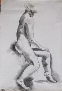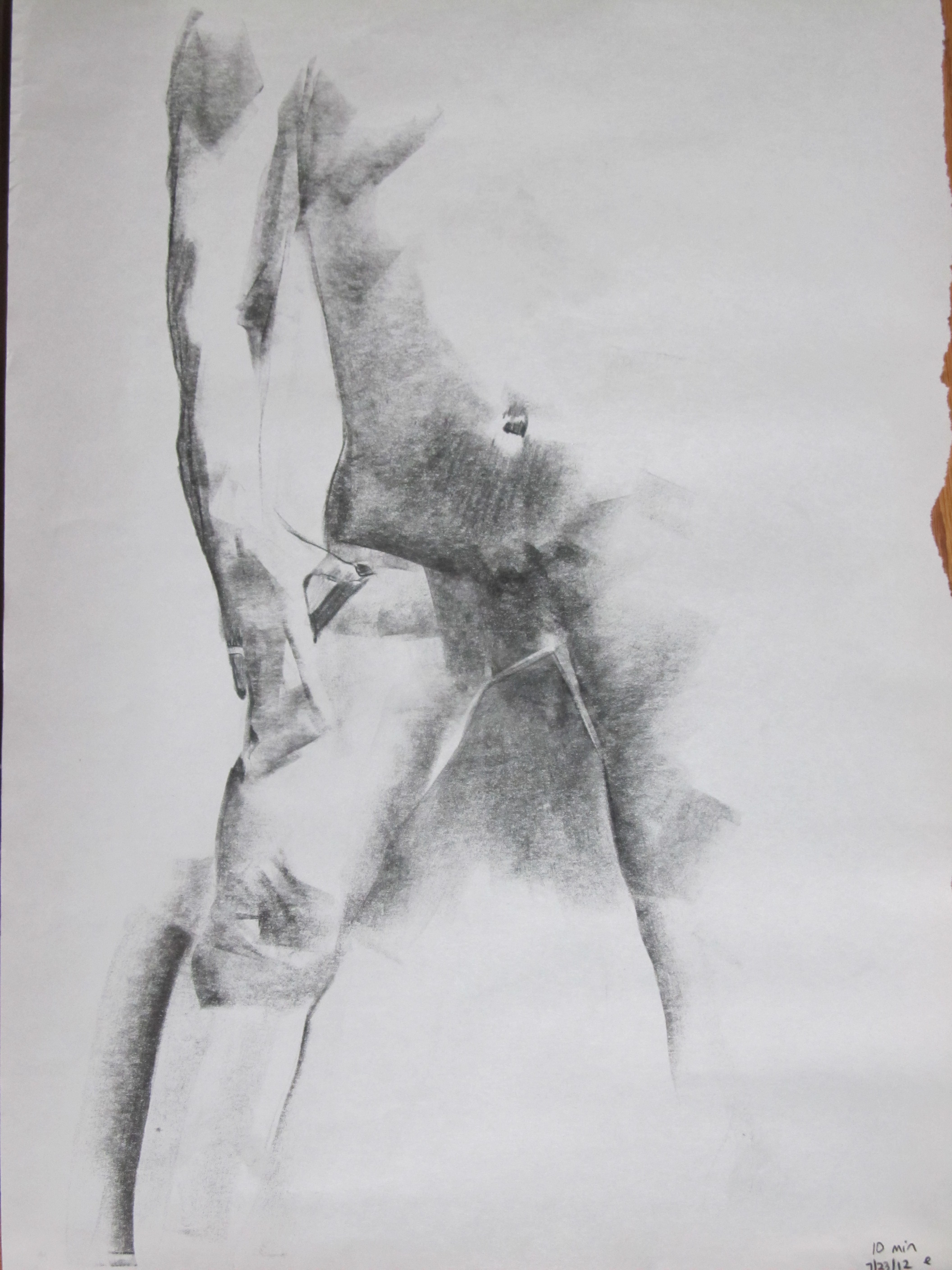 On the next two, however, I felt like I was being fiddly and had lost that eye for the light, and the sweep of the charcoal. D (the first 10-minute pose) has some good things going on in the elbow and the legs, but it also has me doing some of my clunkiest details with the wrinkles under the arm. My own arm felt stiff. (Sorry I can’t intersperse the photos the way I would like. They are below.)