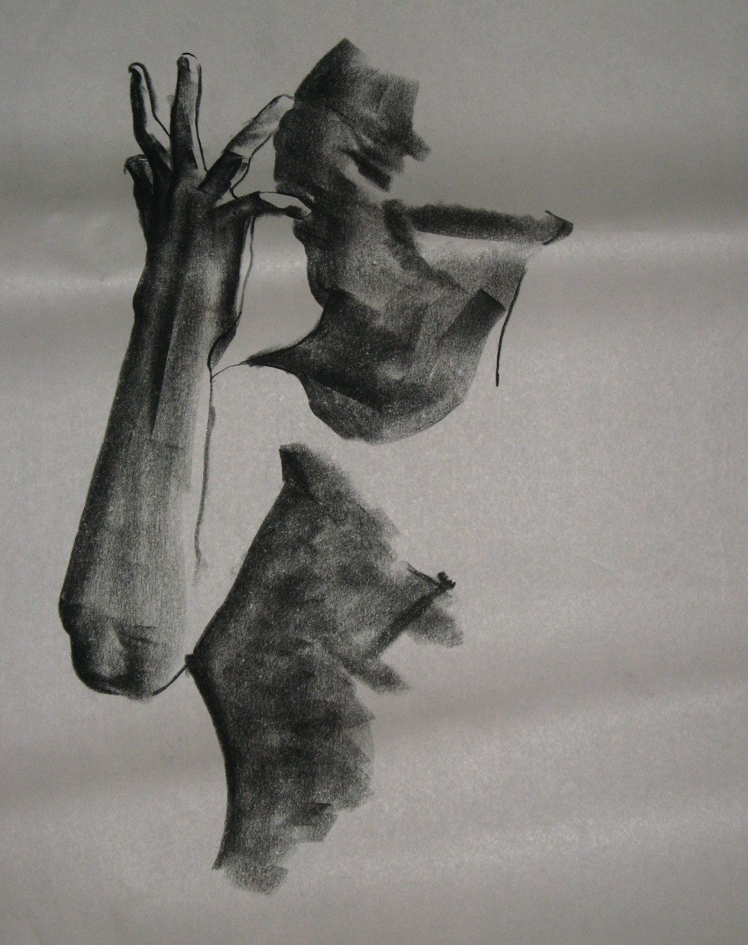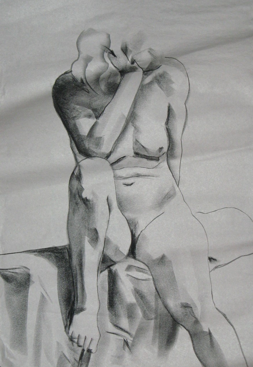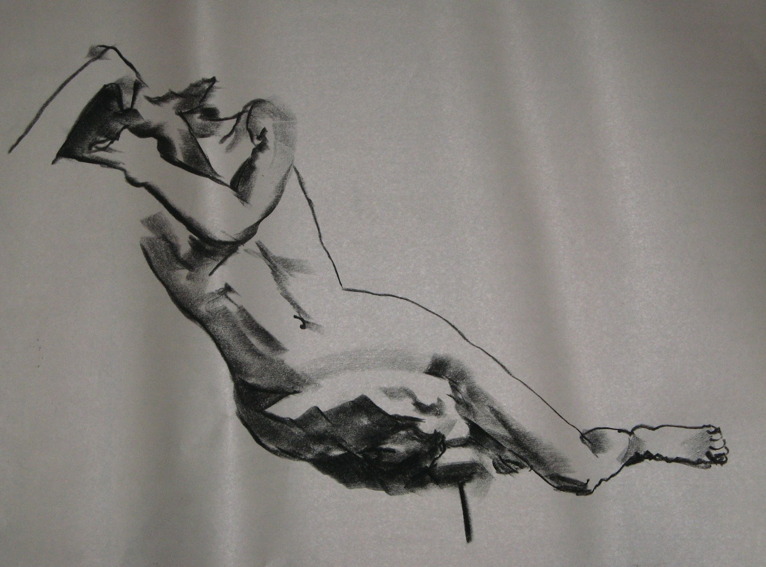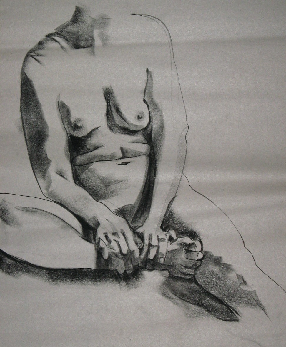 The day I did this drawing, I knew it was some kind of breakthrough. It has to do with the cleanness of the edges of the shadows. I get really frustrated with myself when all my marks are mushy. These are not mushy. They’re almost Cubist in appearance in places, as happens when I work so much and so firmly with the long edge of the charcoal. But the shading on the belly is subtle without being wishy-washy. Something really good was happening here.