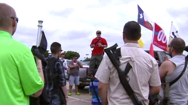 Men armed with semiautomatic weapons in a Target parking lot, Irving, Texas, 2014. Irving is the Dallas suburb in which Ahmed Muhammad was detained yesterday after a teacher was afraid his electronics project was a bomb. Screen shot from KDAF-TV.