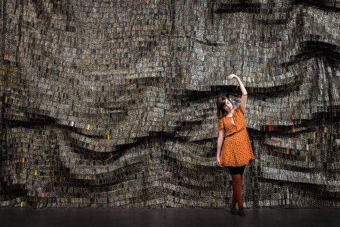I love this photo for three reasons. It pulls back far enough to convey how fluid and soft Anatsui’s sculptures appear (they are in fact made of thousands of tiny bits of scrap such as bottle caps). It shows the scale of the piece. And–oh, my heart–it is a portrait of our late, beloved friend Bean.