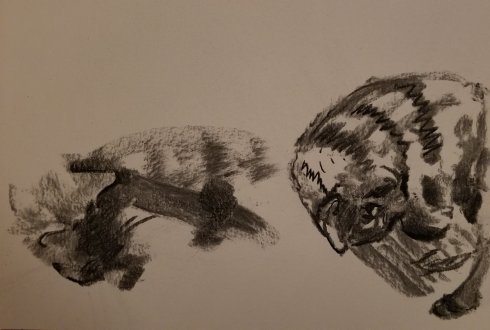 The cat spends the entire day in one spot, but she actually seldom stays still for long. It’s hard for me to draw fast enough to capture one pose before she stretches and turns and settles into another one.
