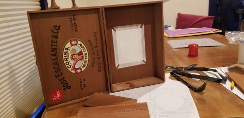 I also had a great time drilling successively larger holes in the door (lid) to make a peephole. The cigar box wood splinters so easily that I thought for sure I’d have a disaster if I tried a large bit first, so I worked my way up to a 1/2-inch bit.