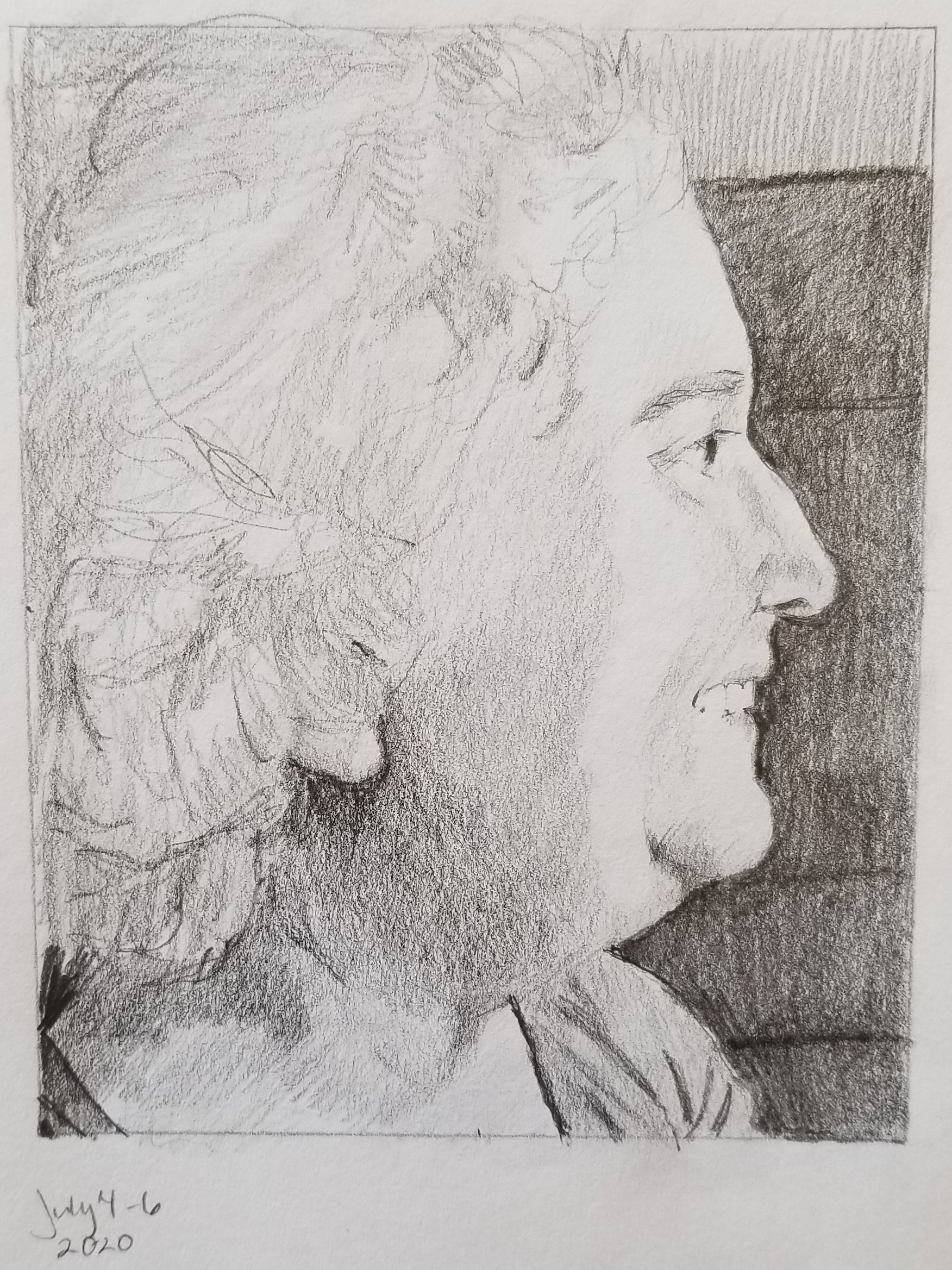 The last week of the drawing class we took from Katie Gilmartin was devoted to portraits. First, another profile (my previous one, of my daughter, is a couple of posts back). I’ve drawn a lot of self-portraits over the years in a high school for the arts and then as an art major, but I’ve never drawn a profile, so I took a lot of pictures of myself in profile and drew this.