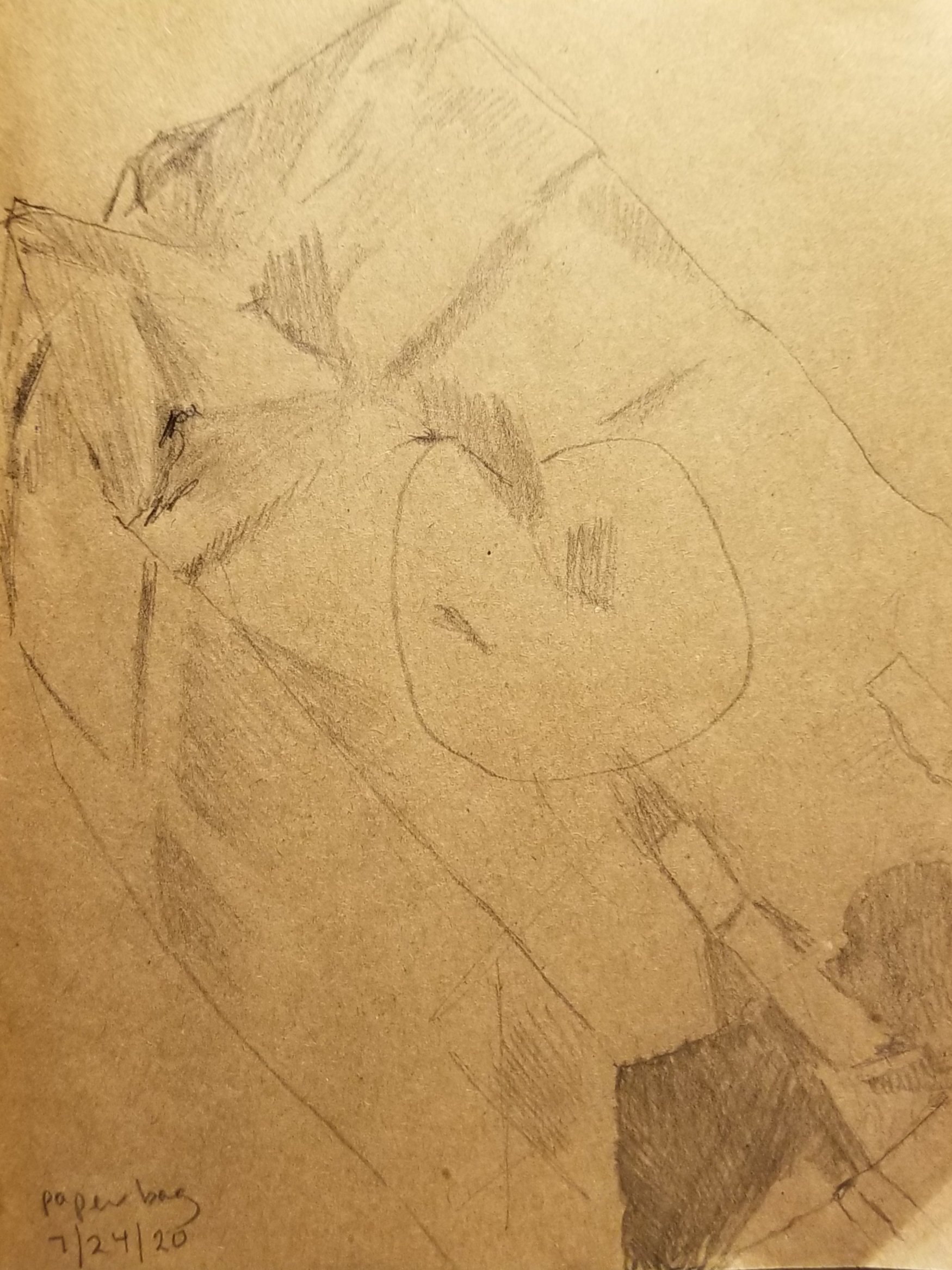 Since these mind games seem to be the most effective way to get myself to do the things I really want to do, I’m doing it again. Art every day, if only for ten minutes. Preferably as the first thing I do, during or immediately after breakfast. I hunted around for an interesting shape, and lit on the shadows on this grocery bag.