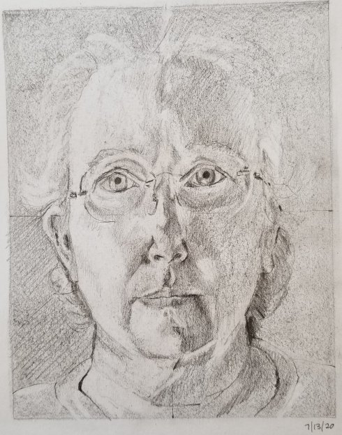I got to something like “finished” an hour before class and just could not bear to erase and re-draw my left (picture’s right) eye, even though it is too close in. But I may yet redraw it, and the nose, which is nicely done but a little narrower than in reality. Or just make another drawing.