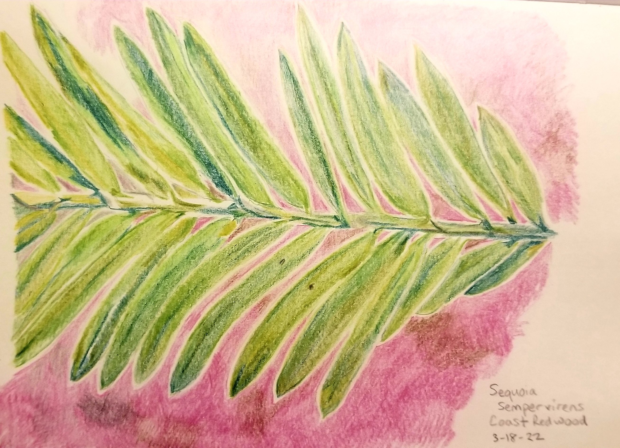 Presenting a very small, young, short-lived part of a tree that grows to be very tall and old, a Coast Redwood.