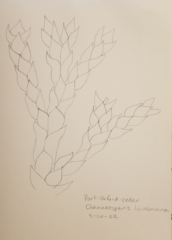 In any case, for a tree to belong to this genus, Chamaecyparis, it must have scale-like leaves in adulthood, which means that here on my 55th tree, I have at last moved on from needles! This drawing feels like a schematic; I was just learning how these little scales fit together. What’s the pattern, and how does it change when a new twig (twiglet?) branches off? It’s fun to learn it. I will get a lot more familiar with them over the next few weeks, because there are 23 other trees with scale-like leaves here in western North America.