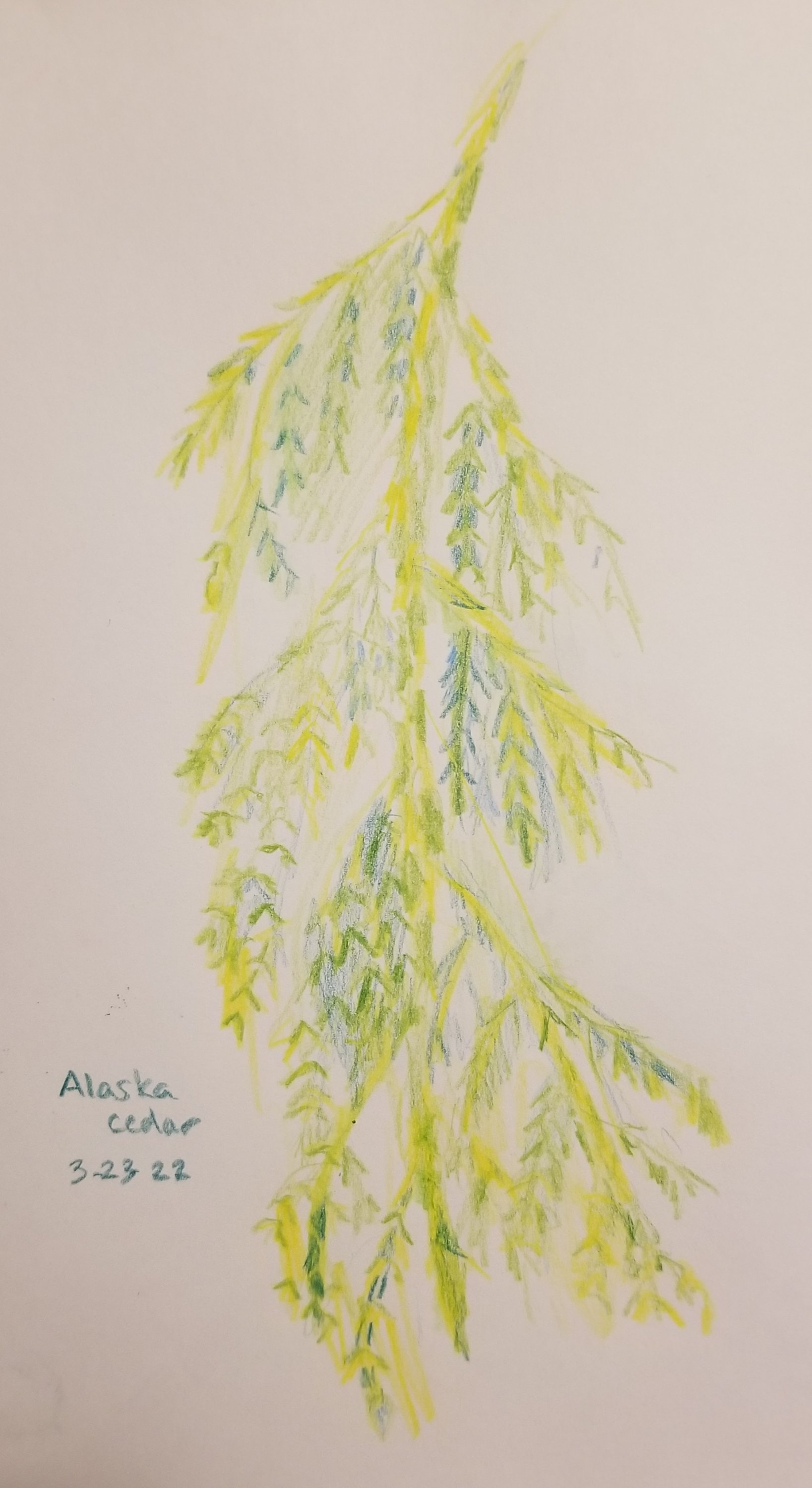 And I am at the back page of the sketchbook my daughter gave me a year or two ago. The last entry: a weeping branch of Chamaecyparis nootkatensis.