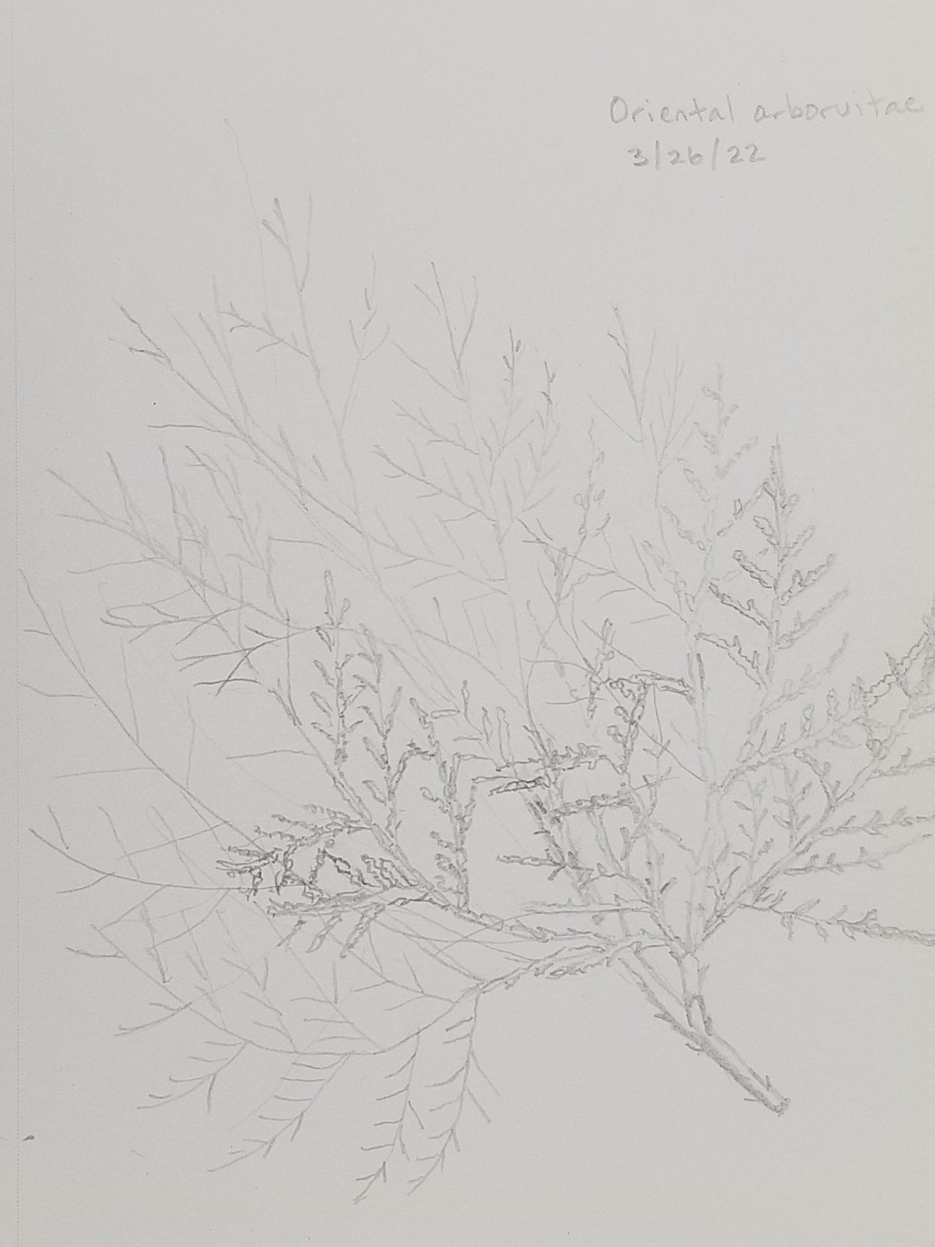 This is yesterday’s drawing, because last night was so packed with packing and work deadlines. We are on the road. Oriental arborvitae kept me happy as we waited for a delayed flight, and tonight I’ll be in another state and draw the next one.