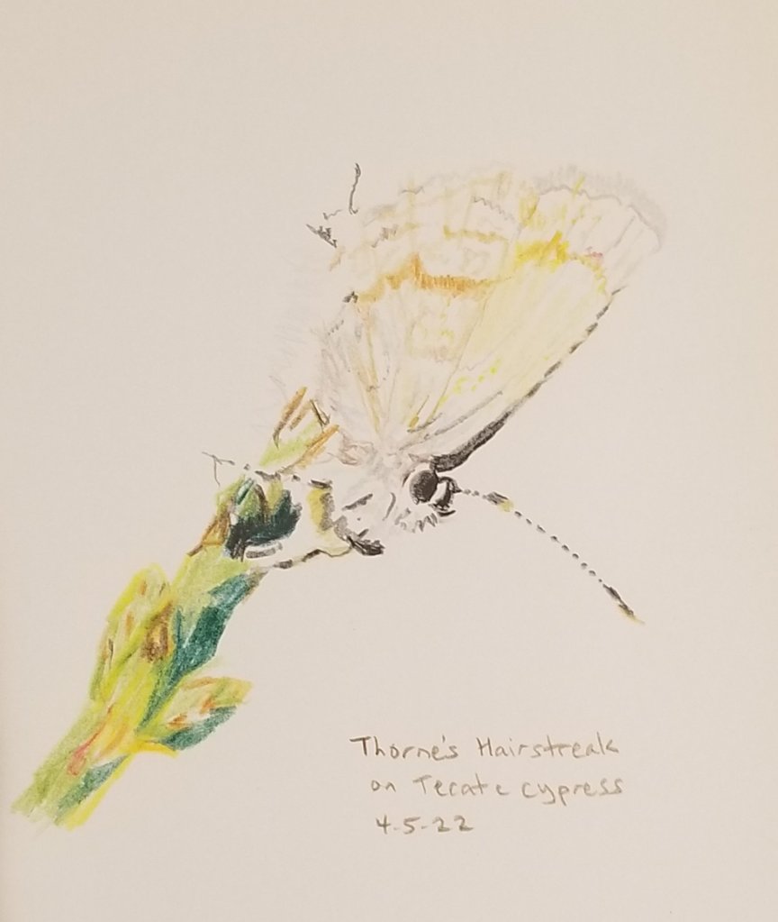 But the Tecate cypress! Its range is limited almost entirely to San Diego County, and it is the only home of the Thorne’s Hairstreak butterfly. Between that and the fact that my inspiration for this yearlong project was my friend Janet’s year of butterflies, of course I had to draw the two species together. They are intertwined–the larvae of the butterfly, which lays her eggs on the cypress, look very much like the tree’s leaves–and both endangered.