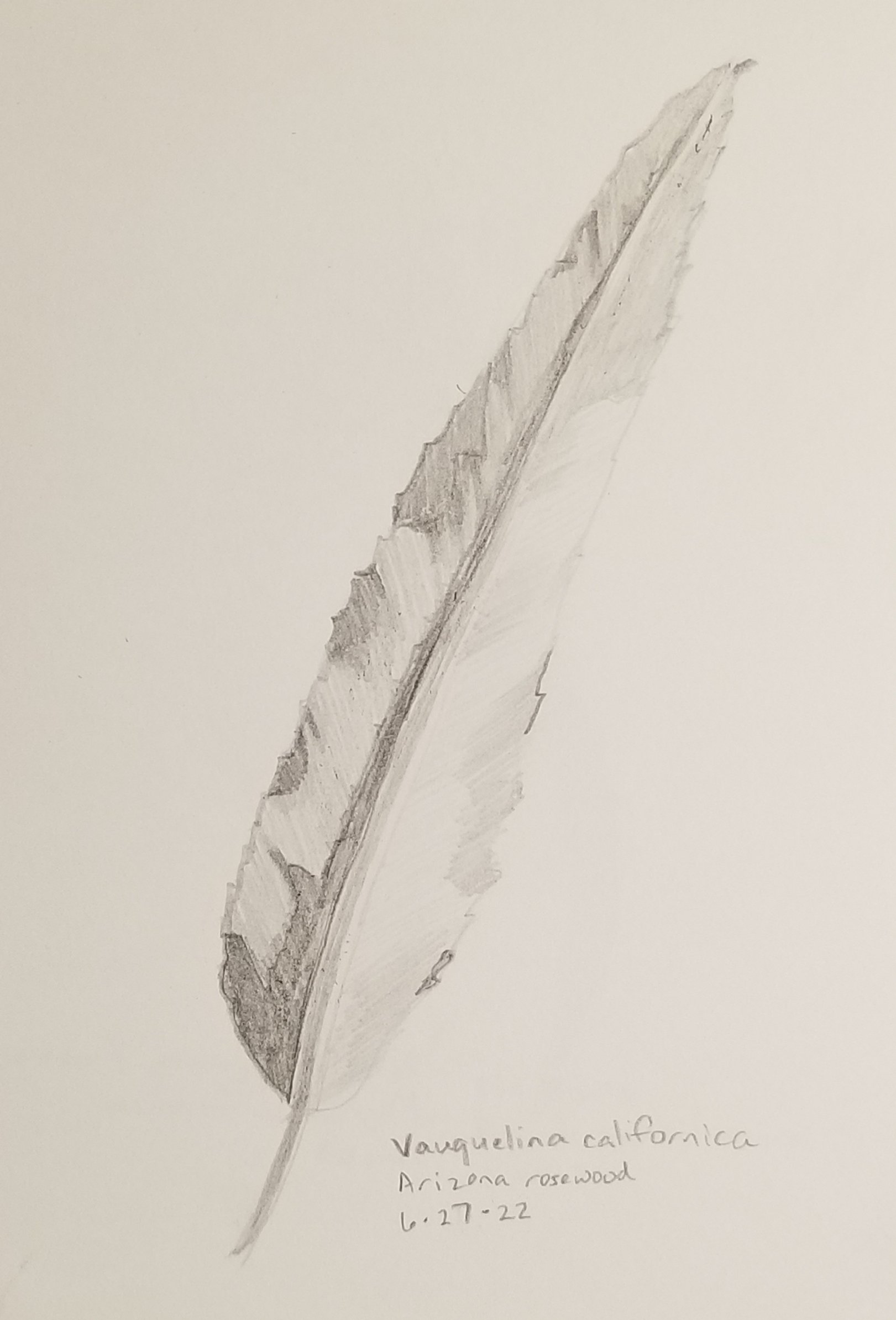 Since I don’t have the book, I mentioned my problem on Facebook, and two friends who love doing research dove right in. Aleks’s best guess is this: Vauquelinia californica, common name Arizona rosewood. Why is Arizona in the common name and California in the scientific name? What happened to the John Torrey connection? Is this the tree that appears next in my field guide? Some of these questions may be answered soon. In the meantime, it is a leaf, and I drew it, and that’s the most important thing.