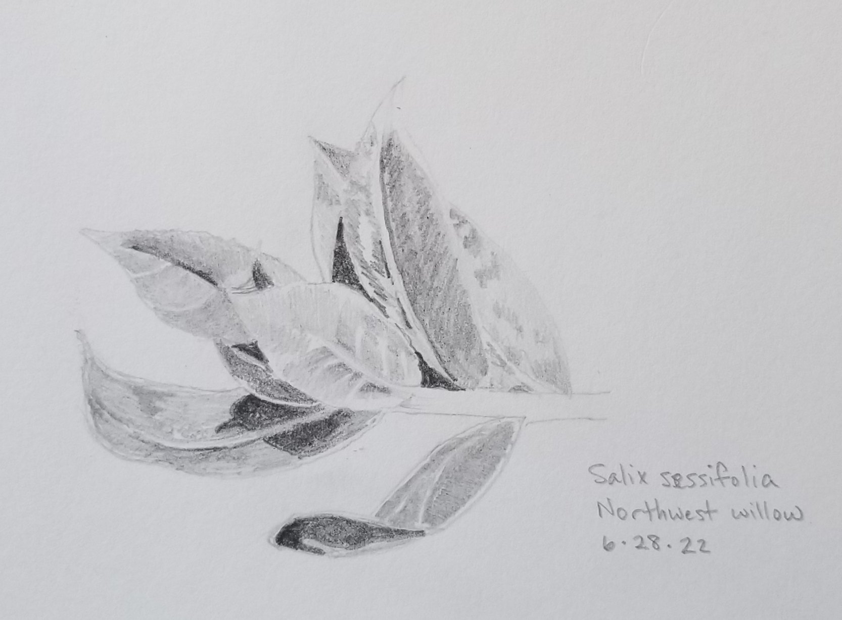 Another mystery born of jotting down just a common name from my 1982 field guide. When I searched on the name “northwest willow,” I got Salix exigua, which I already drew a couple of weeks ago (common names: sandbar willow, narrowleaf willow, or coyote willow–not northwest willow, according to Wikipedia, but there you are). Hm. My friend Aleks dug up Salis sessifolia, also known as northwest willow, so I happily drew that. I’ll find out when I get home whether it’s what the field guide had in mind.