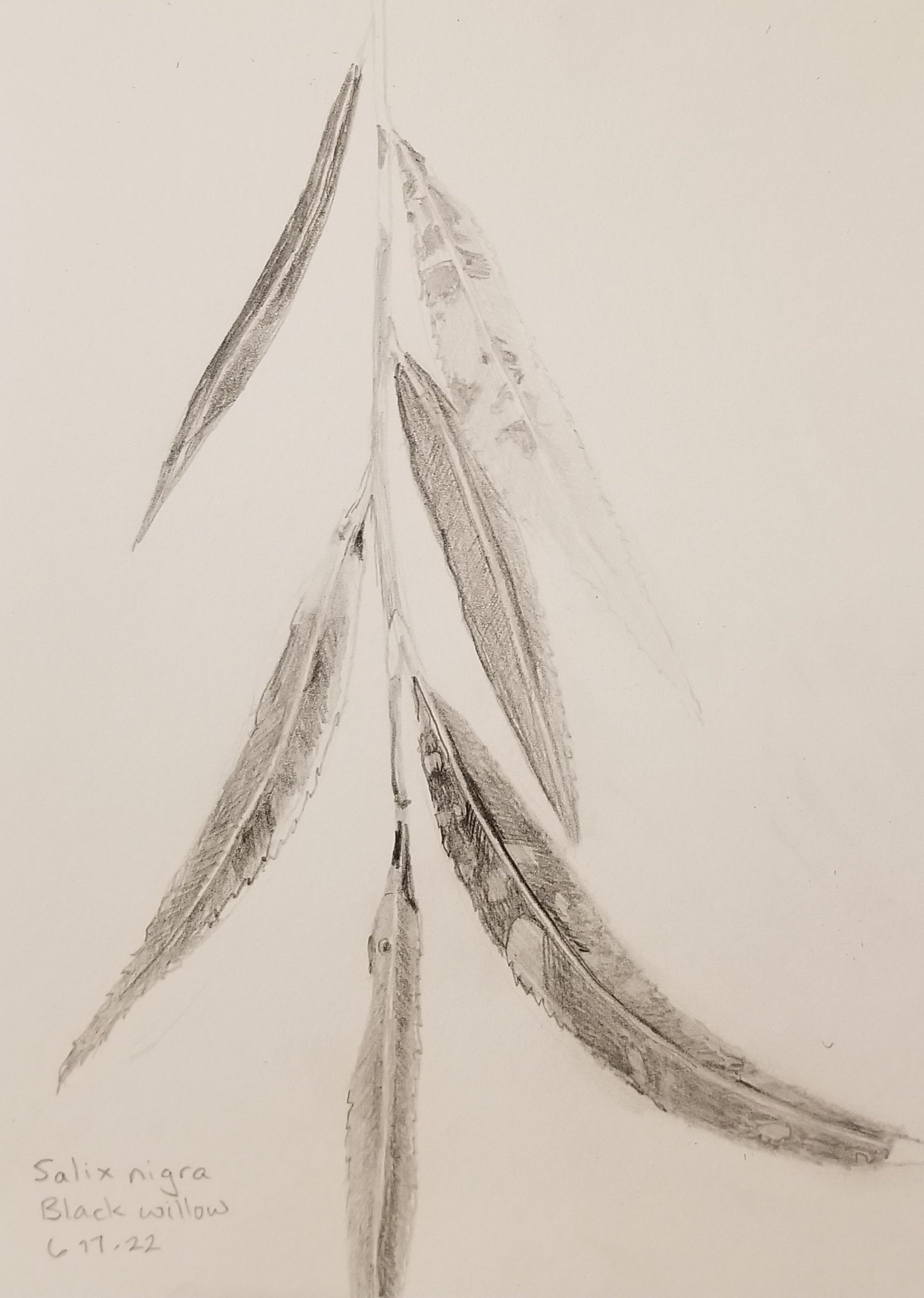 Drawing six leaves takes six times as long, but sometimes I just can’t resist the shape of a whole twig of them falling like this. And I’m on vacation.