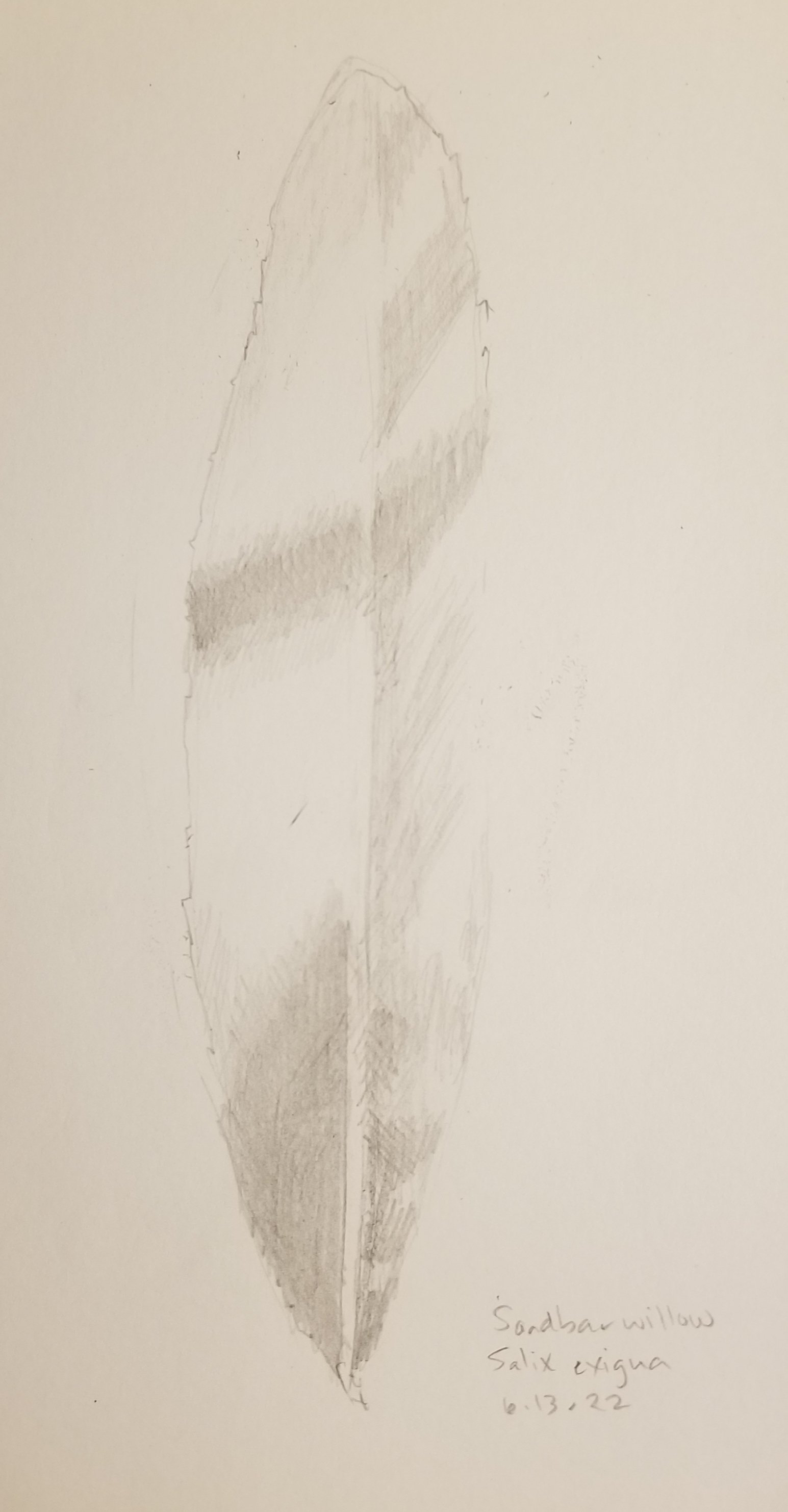 This willow goes by many names: Pacific willow in my field guide, but also red, whiplash, and shining willow (the translation of the scientific name). What I’ve drawn here is not a leaf, strictly speaking, but a stipule: a little quasi-leaf that grows at the junction of a twig and the stem of a leaf. And the ones on S. lucida are fuzzy and shiny, which is more than I care to try to get across in my drawing tonight. It’s been a pleasant, but long and full, day, and one steeped in art. Earlier, I drew a copy of a self-portrait from one of Cezanne’s sketchbooks, and a clandestine portrait of an old man on the bus.