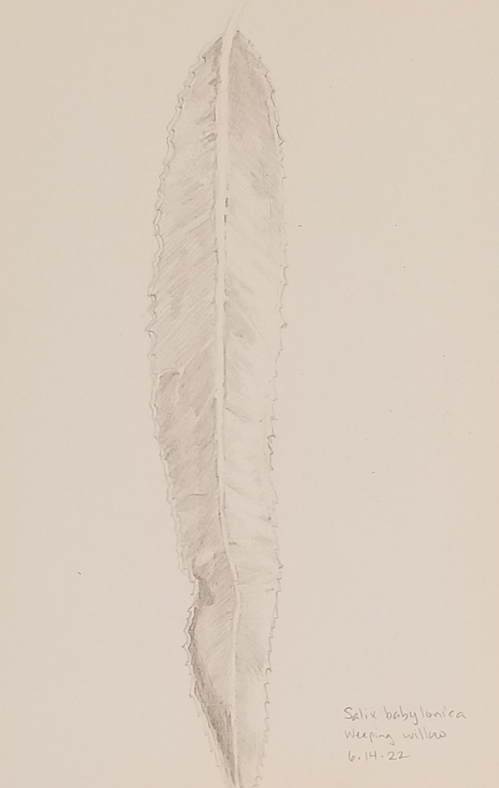 This is a weeping willow leaf, and its scientific name is Salix babylonica. That has to be a reference to the beginning of Psalm 137, right?: “By the waters of Babylon, we sat and wept when we remembered Zion.”