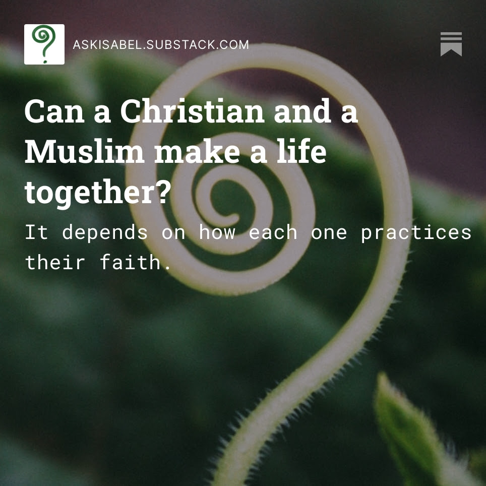 As I noted last week, I launched Ask Isabel, the spirituality and religion advice column that I’d been mulling since the spring. During our travels this summer, I did research, made the website, and started writing. The second column posted today: Can a Christian and a Muslim make a life together? I hope you’ll check it out, and subscribe if you’d like to receive it via e-mail every Tuesday. And of course, please share the link with anyone you think would enjoy it.