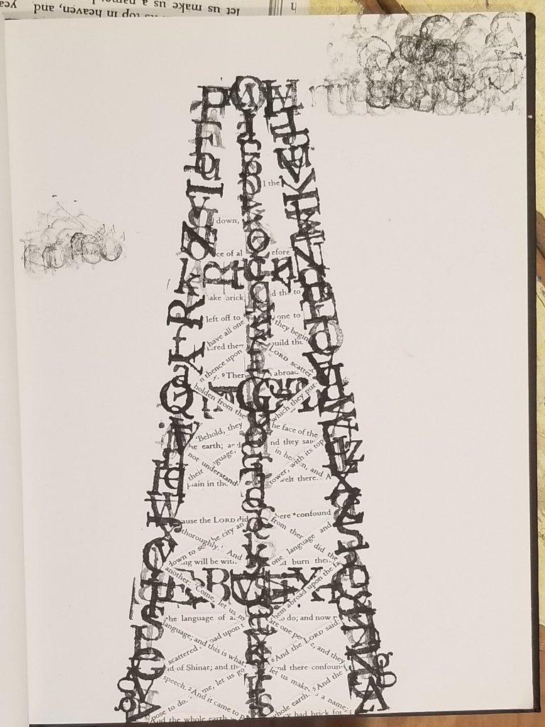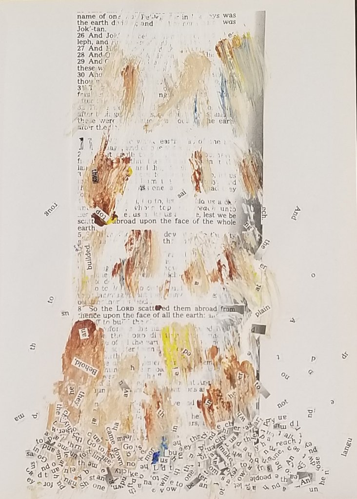 I’m not sure if this one is finished. I had envisioned many more fragments of words falling and heaped up, and I’m not sure if I paused here because it is done, or because I got tired of gluing tiny rectangles of paper. I’ll look at it afresh tomorrow and see.