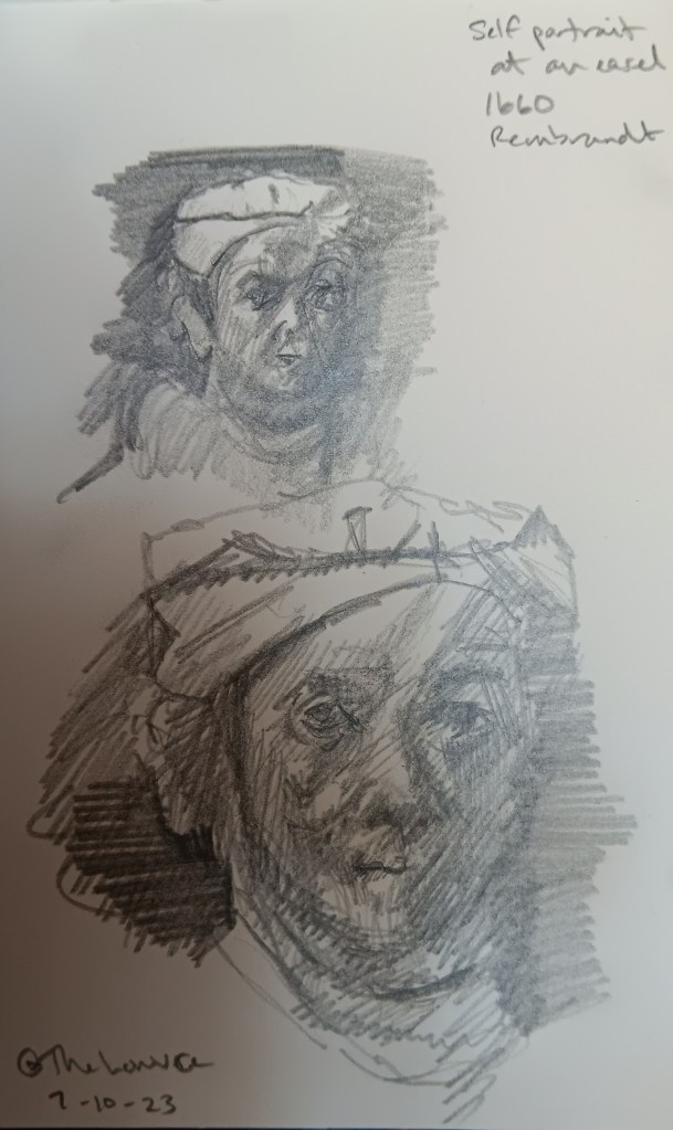 The first try was way too small, and when I went closer to see some details that I hadn’t been able to see from the seat on the other side of the room, I hadn’t left myself room to have a prayer of including them. So I started again at twice the size (still a thumbnail of a detail; the painting is about 3×4′). As with Vermeer: the light, the light, though with Vermeer I always have the impression of light’s falling on the subject, whereas with Rembrandt self-portraits, I usually have more of a feeling that he is emerging, partway only, out of a palpable darkness.