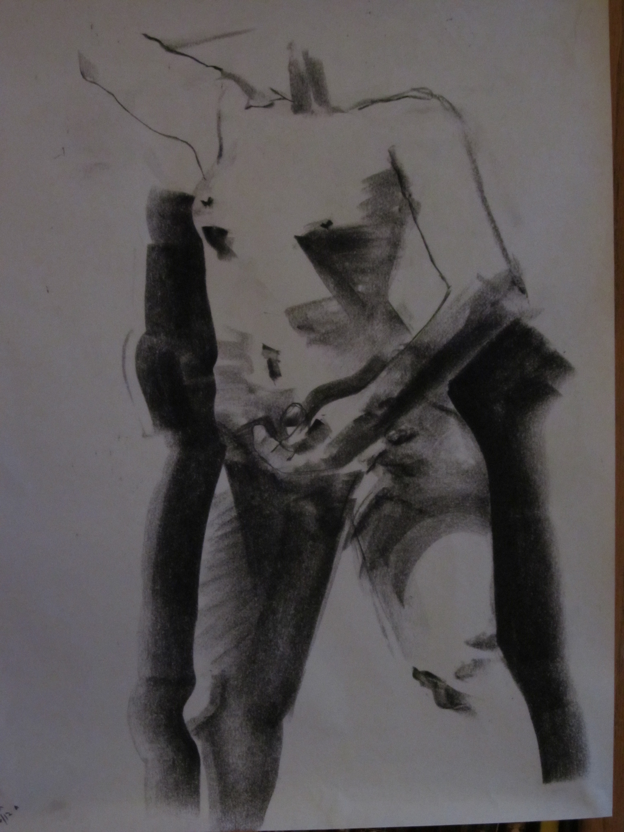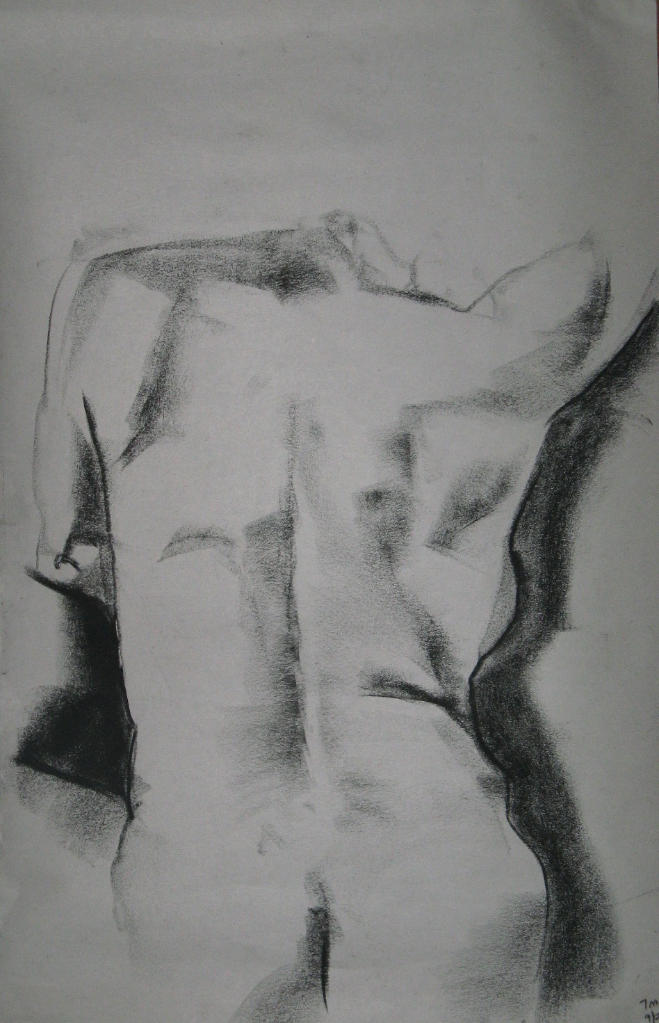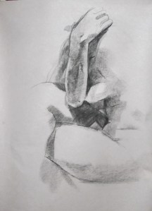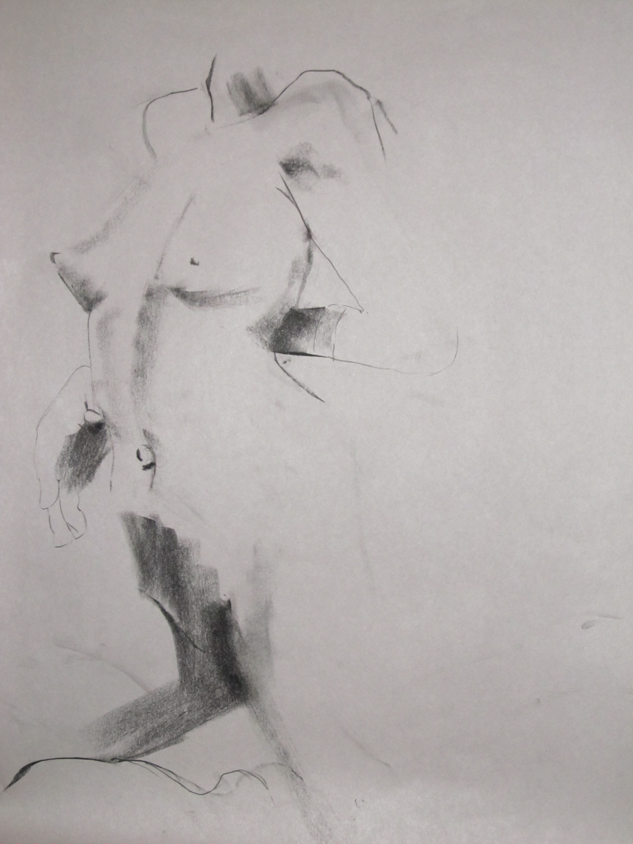. . . when the only reason to keep photos of the drawings seems to be so that when I look back on several months of work, I’ll remember that there are bad days. At least, that’s what I thought looking over my drawings last night. But because I was having a hard time, I tried to change things up. I drew this really dark, for example. I tend to go too light, exacerbated when the model has really light skin, and on a bad day I go lighter because I’m feeling tentative. I don’t want to commit to anything I put on paper. For the same reason, I draw more slowly when I’m thinking everything I’m doing stinks. So I forced myself to use only the darkest charcoal and work fast and with minimum pauses on this one, and it helped loosen me up.