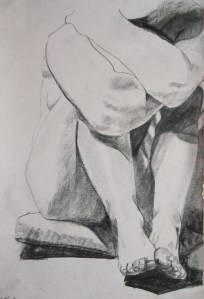 On the next two, however, I felt like I was being fiddly and had lost that eye for the light, and the sweep of the charcoal. D (the first 10-minute pose) has some good things going on in the elbow and the legs, but it also has me doing some of my clunkiest details with the wrinkles under the arm. My own arm felt stiff. (Sorry I can’t intersperse the photos the way I would like. They are below.)