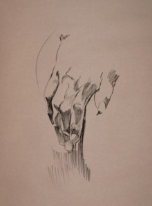 The drawing I was happiest with was this one. I sweated over that first-finger knuckle. Just about gave up on its looking like anything except a glaring white circle on a dark expanse, but when I walked away and came back to look at the drawing, there it was, looking almost real. So was the vein in the arm, which I’d given up as a failure. Drawing is like magic.