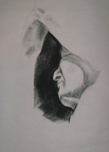 My aim in this one was to include both hands. The left one got short shrift and so came out flat. The right one, though, is a lesson to me in how few marks are needed to make the full shapes emerge. It’s quite minimal and yet it works, unlike the more elaborate shading on the forearm.