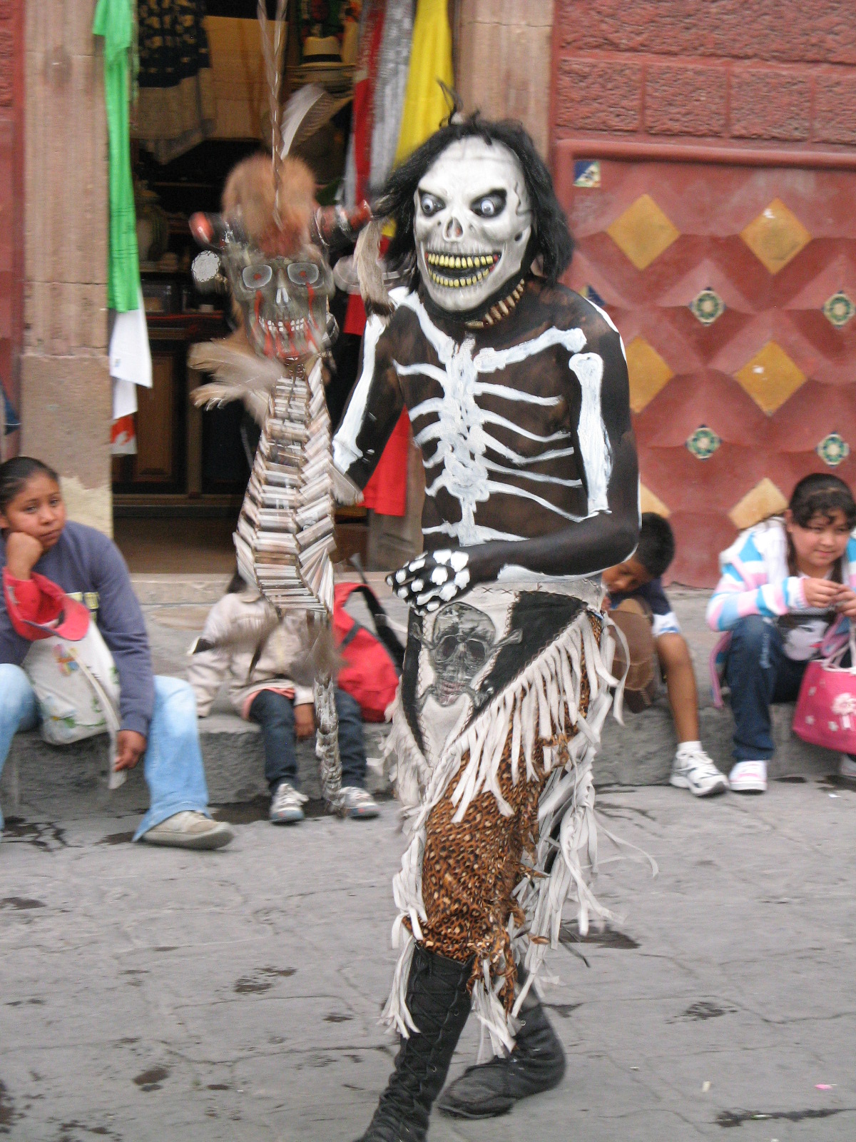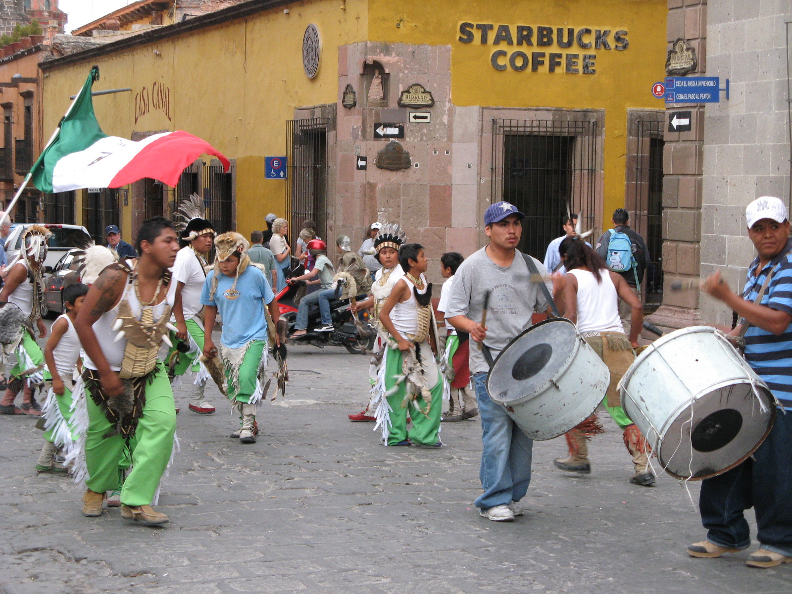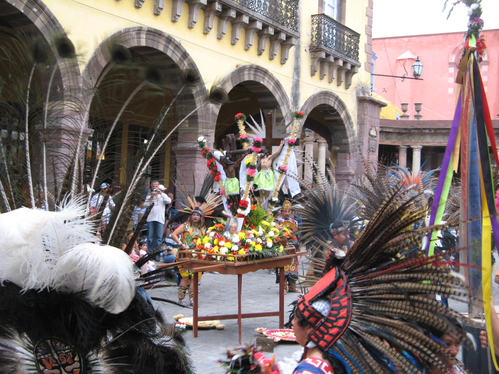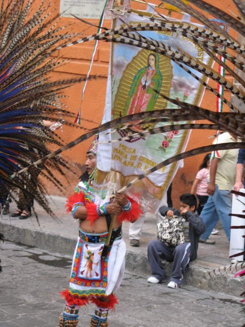 The good old Catholic church. “Fine, keep your feathers and your drums and your heathen dances, as long as you add Jesus into the mix.” (Mexican national pride is part of the mix too, as you can see from the dancers carrying the flag.) I’m betting this relaxed attitude toward syncretism is a more successful way to spread the word than uptightly insisting that indigenous people wear trousers and sing Wesley’s hymns–in short, imposing European cultural forms that are not inextricable from the religious concepts.
