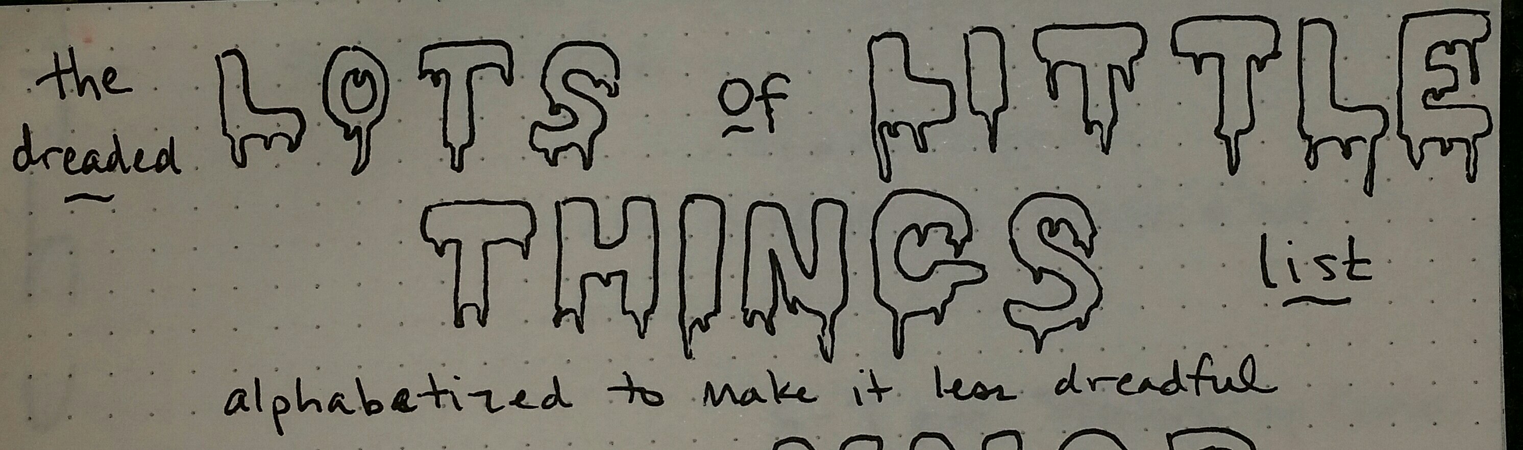 . . . Which I do. And that’s something else I like about the bujo craze: the permission to get arty with my to-do list. Silly, right? Why do I need permission? But like the mixing of journal and work writing, I had a “shouldn’t” in my head that bujo kindly kicked out: I “shouldn’t” “waste” time drawing or doing fancy lettering. Why the heck not? For some people, layouts like these are intimidating, but for me, they’re inviting. A little time spent color-coding my daily list, or delineating sections of the week’s plan with washi tape, or writing the header of my “dreaded list of lots of little things” in a horror-movie-poster font, is my lure to do the planning. It’s fun. And it helps make me want to look at my journal, which is half the battle each day.