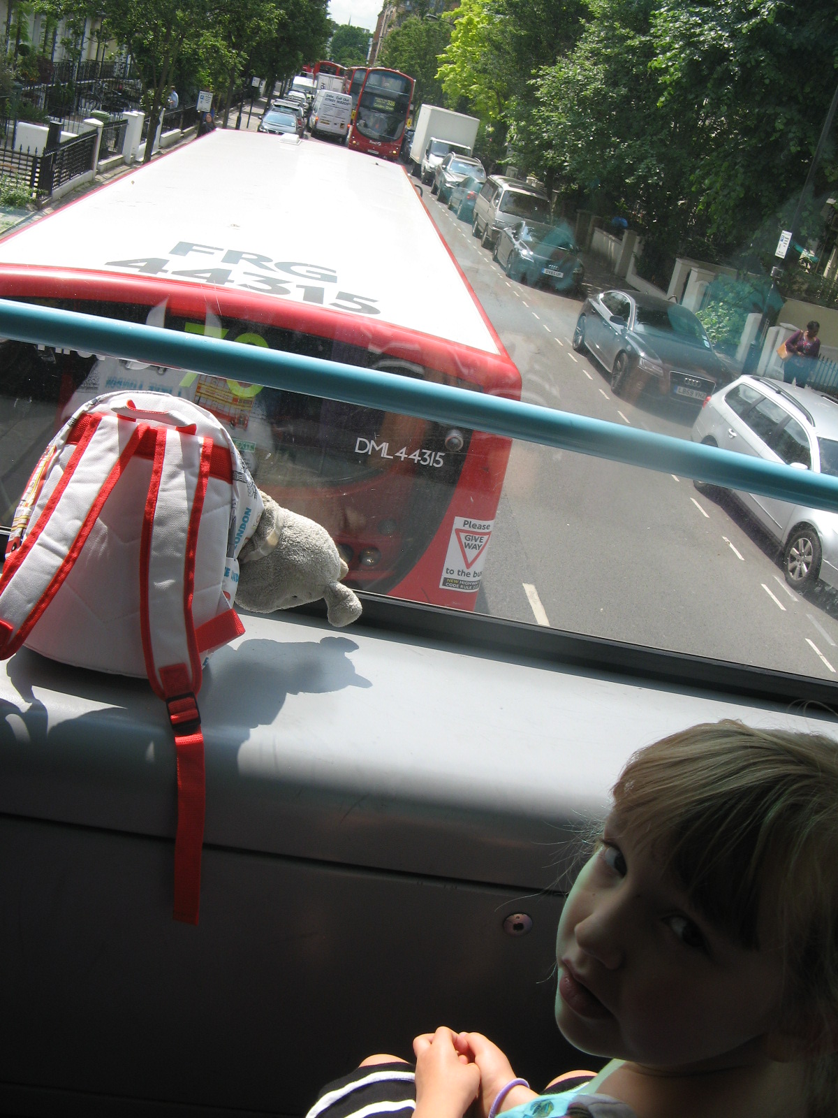 Double-decker buses. Why doesn’t every place have them? This is the way to see a city, as Doggie attests.