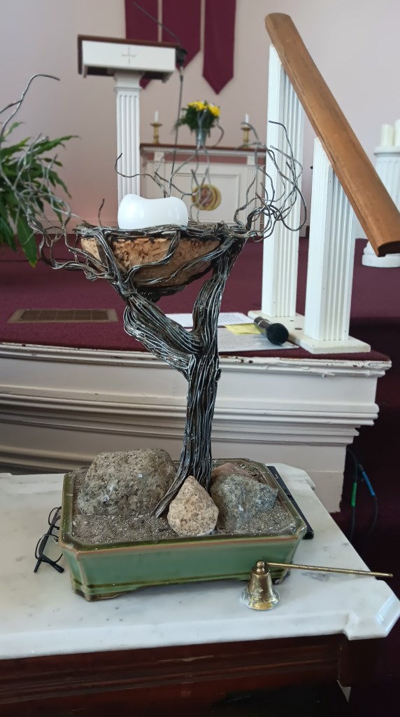 Also on my first day, we walked around the corner to the Unitarian Universalist Society. I didn’t expect it to be open on a weekday morning, but when I tried the front doors anyway, a man waiting in a car called out that he was a member, and could he help us? That question is used so often to mean “What do you think you’re doing?” that it’s hard to convey that he really meant it, but he really meant it. He and his wife had stopped by to take care of a couple of things, so they immediately gave us a tour. In the lovely, sun-drenched sanctuary, we discovered that, like UUCPA, they have a chalice shaped like a tree. Isn’t it striking? I like the nest for the flame.
